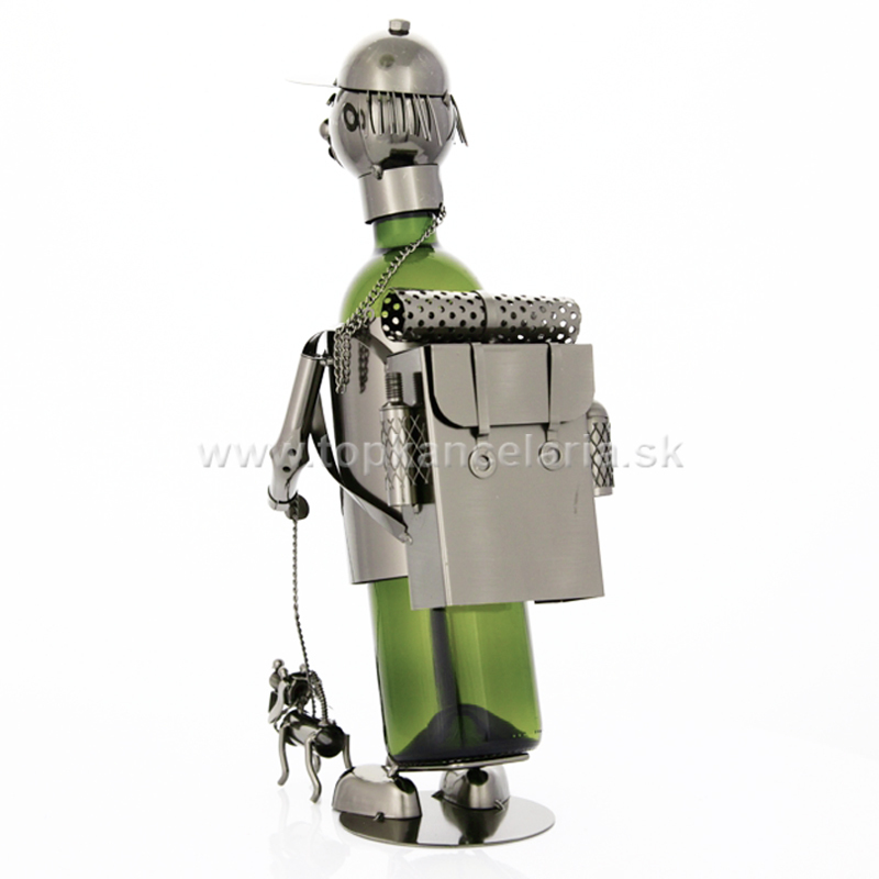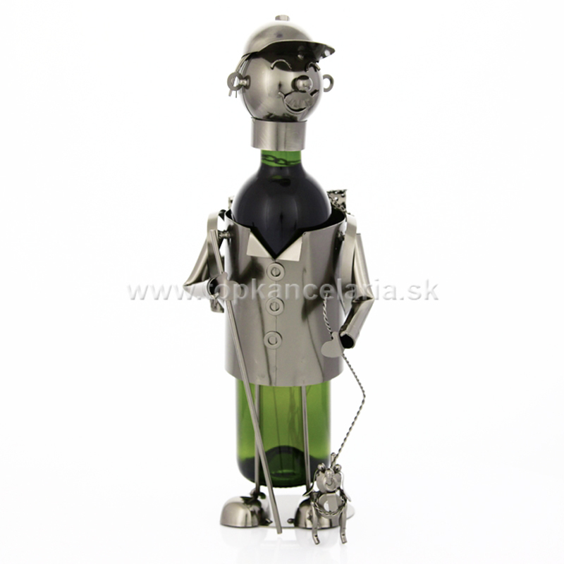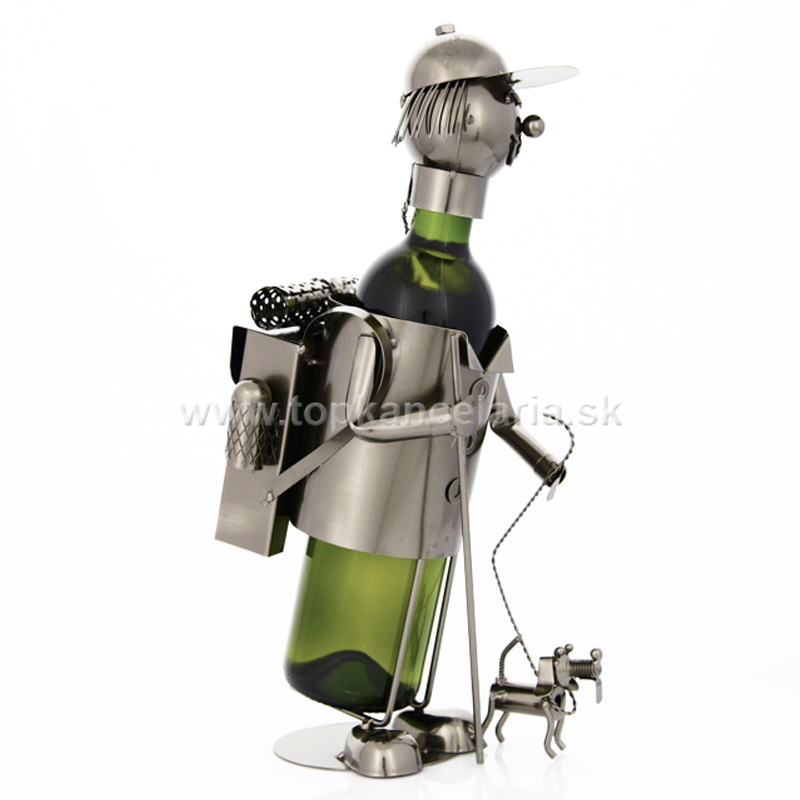 Ručne vyrábaný kreatívny stojan pre klasickú vínovú fľašu 0,75 s motívom turista so psom. Originálny darček pre oslávenca, ktorý určite prekvapí aj hostí. Každý kus je originál. Lakovaná povrchová úprava v platinovej farbe.
