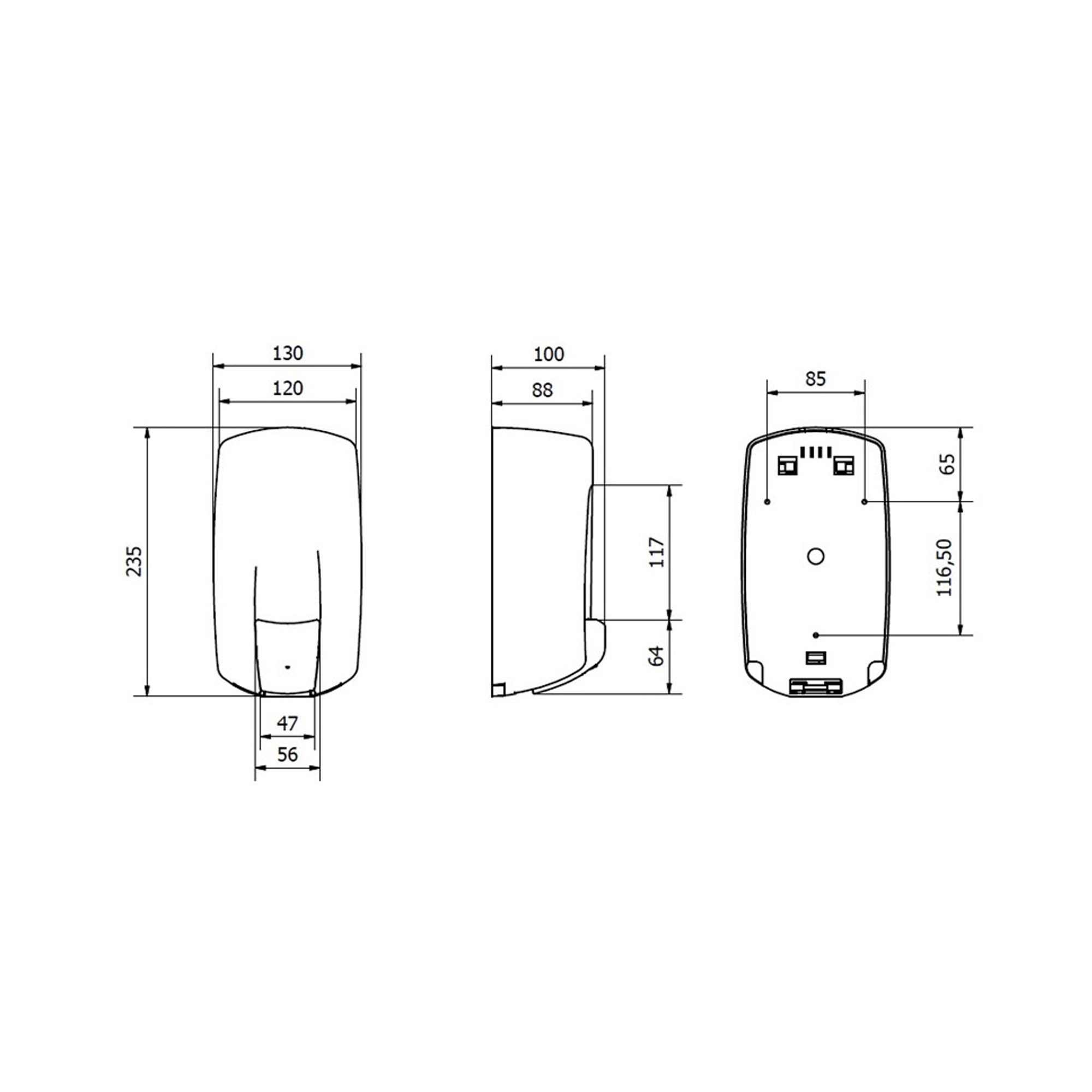 Univerzálny dávkovač tekutého mydla s 0,9l nádržou na dolievanie. Priehladné okienko na vizuálnu kontrolu obsahu mydla. Je vyrobený z odolného ABS plastu. Ľahké a rýchle doplnenie tekutého mydla. Stačí zasunúť univerzálny plastový kľúč (kľúč je rovnaký pre všetky modely), odstrániť horný kryt a naliať mydlo. Ľahká údržba a čistenie. Objem dávkovača 900ml. Rozmery 23,5x13x10cm. Kotviaci materiál 3x hmoždinka so skrutkami sú súčasťou balenia.Vyrobené v EU.