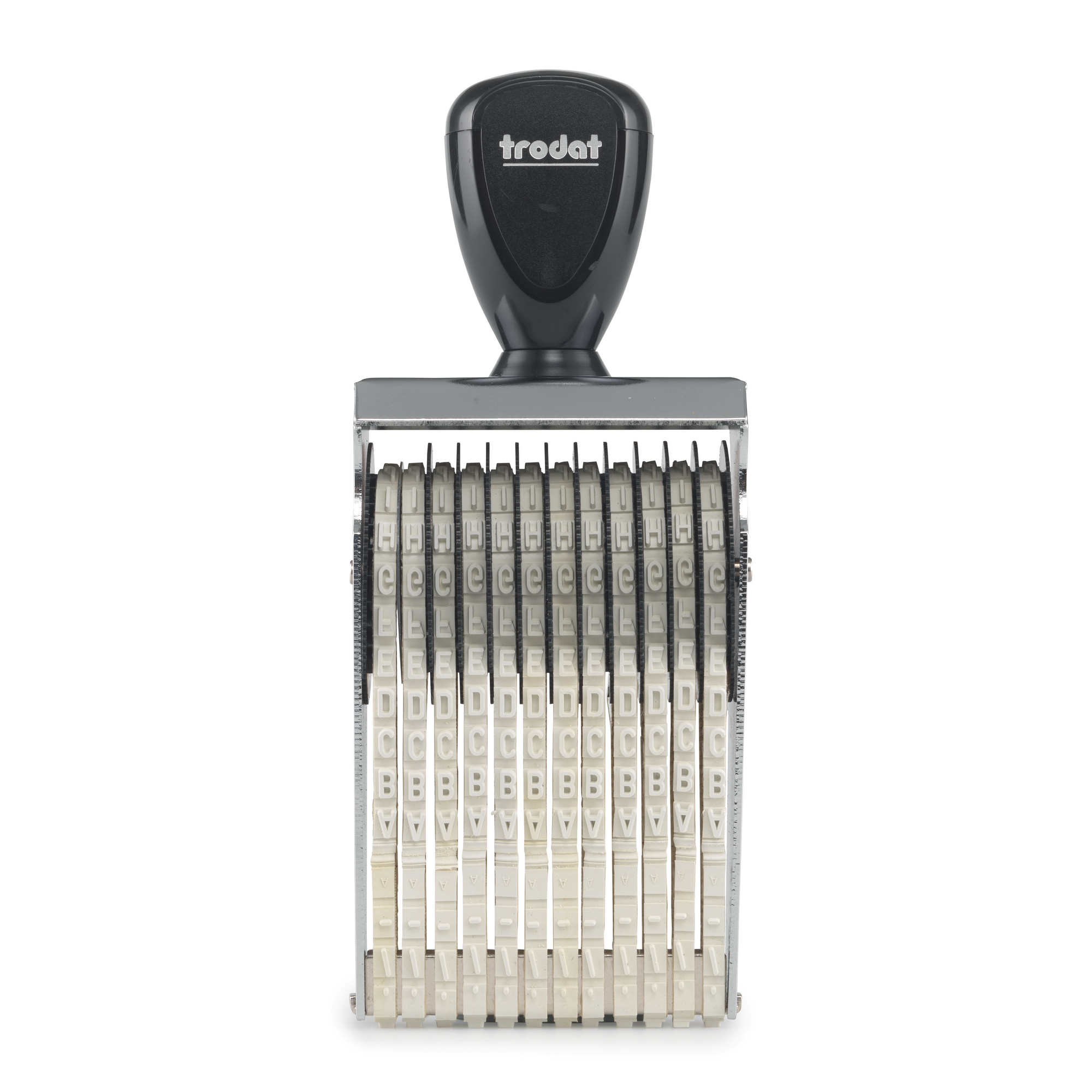 Nesamofarbiaca číslovacia pečiatka. Štandardné verzie obsahujú: 4, 6, 8, 10 a 12 pásiek, ktoré sa môžu na objednávku kombinovať s páskami so znakmi (A-M a N-Z) a/alebo so špeciálnymi páskami so znakmi celkom podľa požiadaviek zákazníka. - Počet čísel: 6 - Výška znakov: 4 mm - Balenie: 1 ks