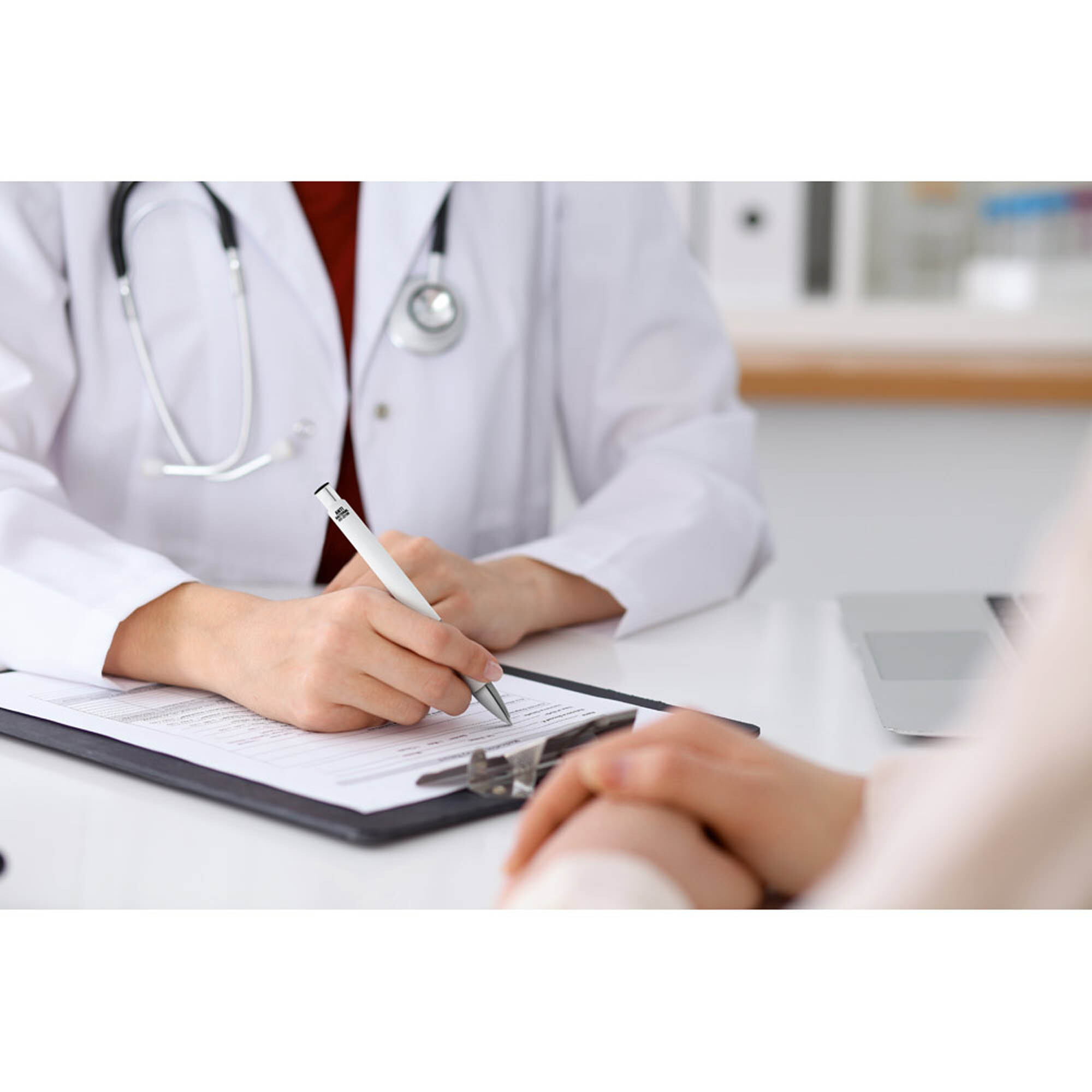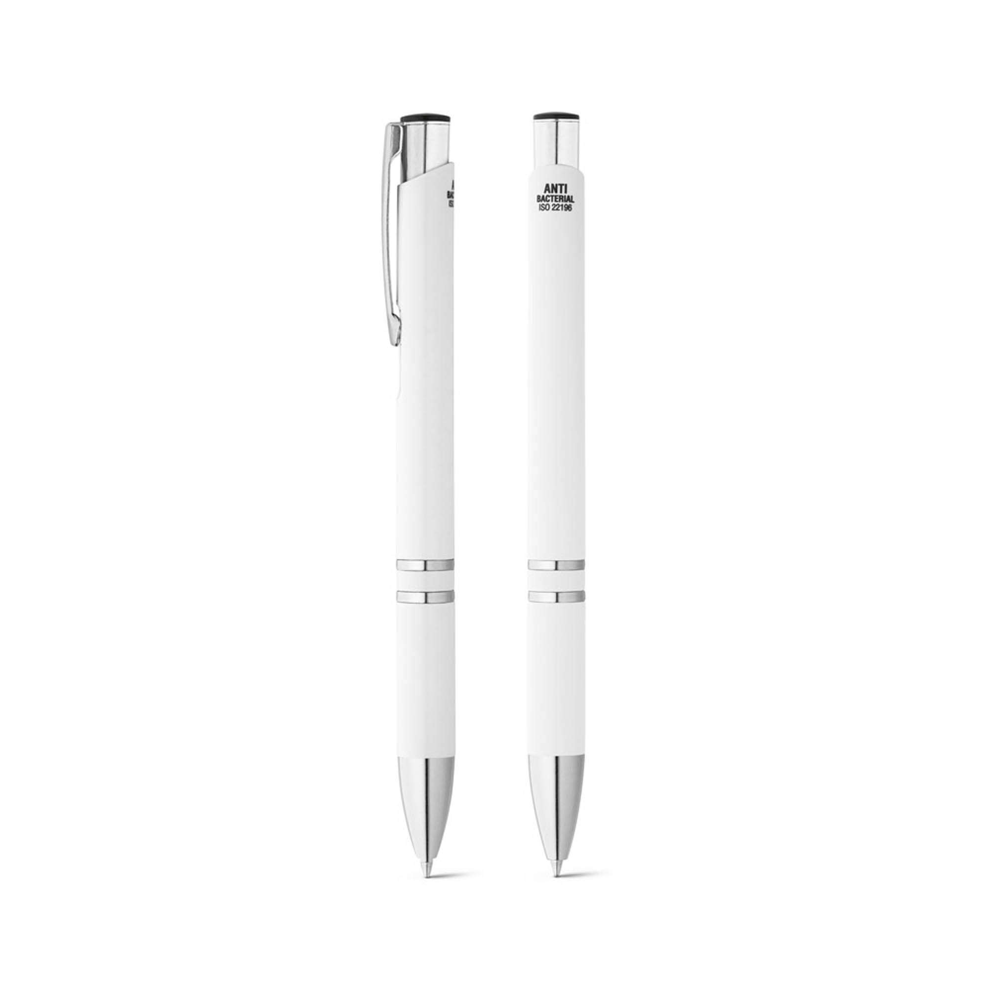 Guľôčkové pero vyrobené z antibakteriálnou úpravou ABS plastu podľa certifikácie ISO22196, ktorú doplna kovový klip. Zapínanie stláčacím mechanizmom. Používa modrú vymeniteľnú tuhu. Rozmer: ø10 x 137 mm. Farba biela