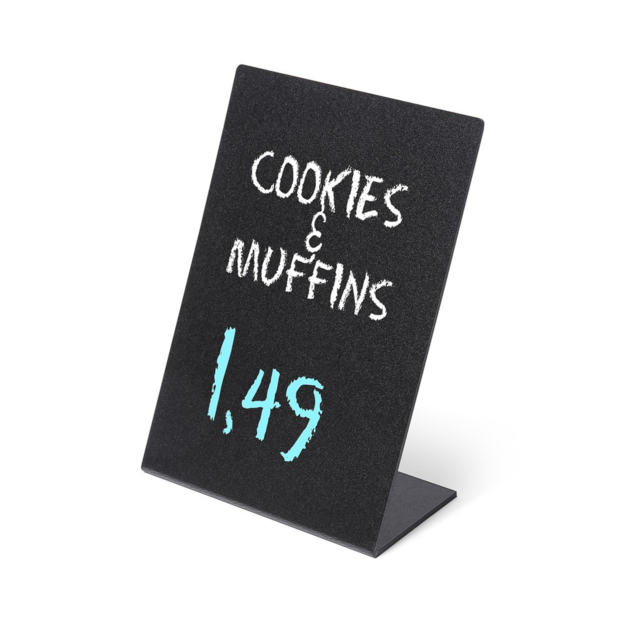 Čierny cenovkový stojanček A5 v tvare L je perfektným riešením pre prezentáciu cien a informácií vo vašom podniku. Plocha je vhodná na popisovanie - pre všetky typy kriedových popisovačov, čo umožňuje jednoduché a rýchle zmeny cien alebo informácií. Kriedové popisovače je možné zakúpiť ako príslušenstvo.Vďaka jeho praktickosti a štýlovému vzhľadu bude váš podnik vyzerať profesionálne a atraktívne. Investujte do kvality a funkčnosti s týmto cenovkovým stojančekom, ktorý je navrhnutý tak, aby splnil všetky vaše potreby.