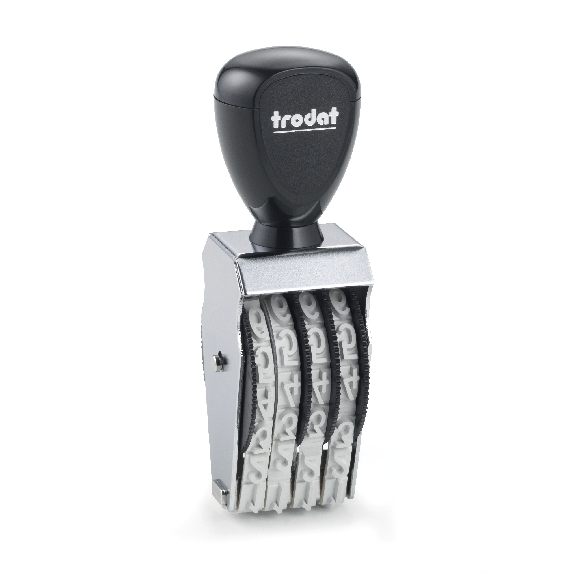 Nesamofarbiaca číslovacia pečiatka. Štandardné verzie obsahujú: 4, 6, 8, 10 a 12 pásiek, ktoré sa môžu na objednávku kombinovať s páskami so znakmi (A-M a N-Z) a/alebo so špeciálnymi páskami so znakmi celkom podľa požiadaviek zákazníka. - Počet čísel: 6 - Výška znakov: 4 mm - Balenie: 1 ks