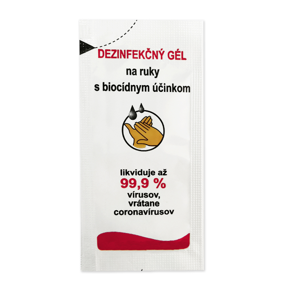 Obal dezinfekčného gélu je vyrobený z pevnej fólie určený na prenos: kabelky, aktovky alebo jednoducho vo vreckách. Účinná látka etanol (denaturovaný) 624g/kg. Po aplikácii dezinfekčného gélu na pokožku za 30 sekúnd vydezinfikuje od baktérii a od kvasiniek. Za 60 sekúnd od vírusov vrátane CORONAVÍRUSU. Za 20 minút od plesní.