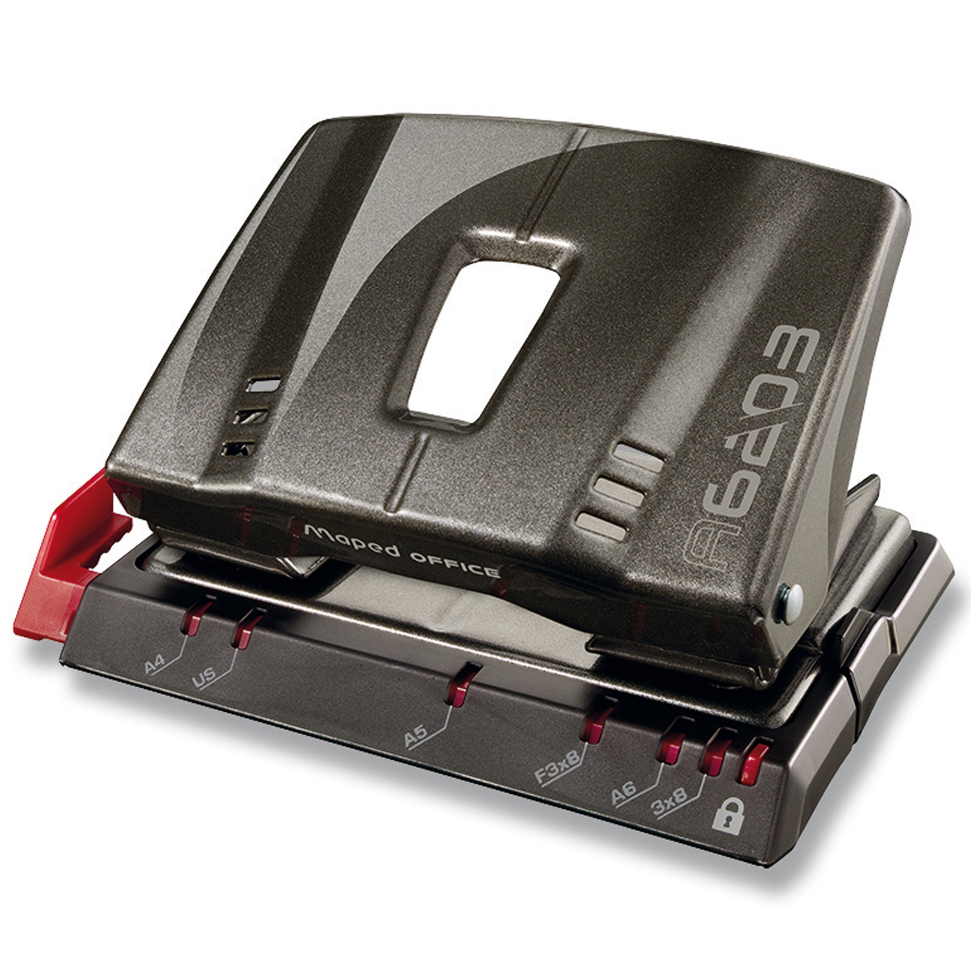 Celokovový výkonný dierovač na 40 listov 80g papiera. Príložník pre štandardné formáty A6, A5 a A4.