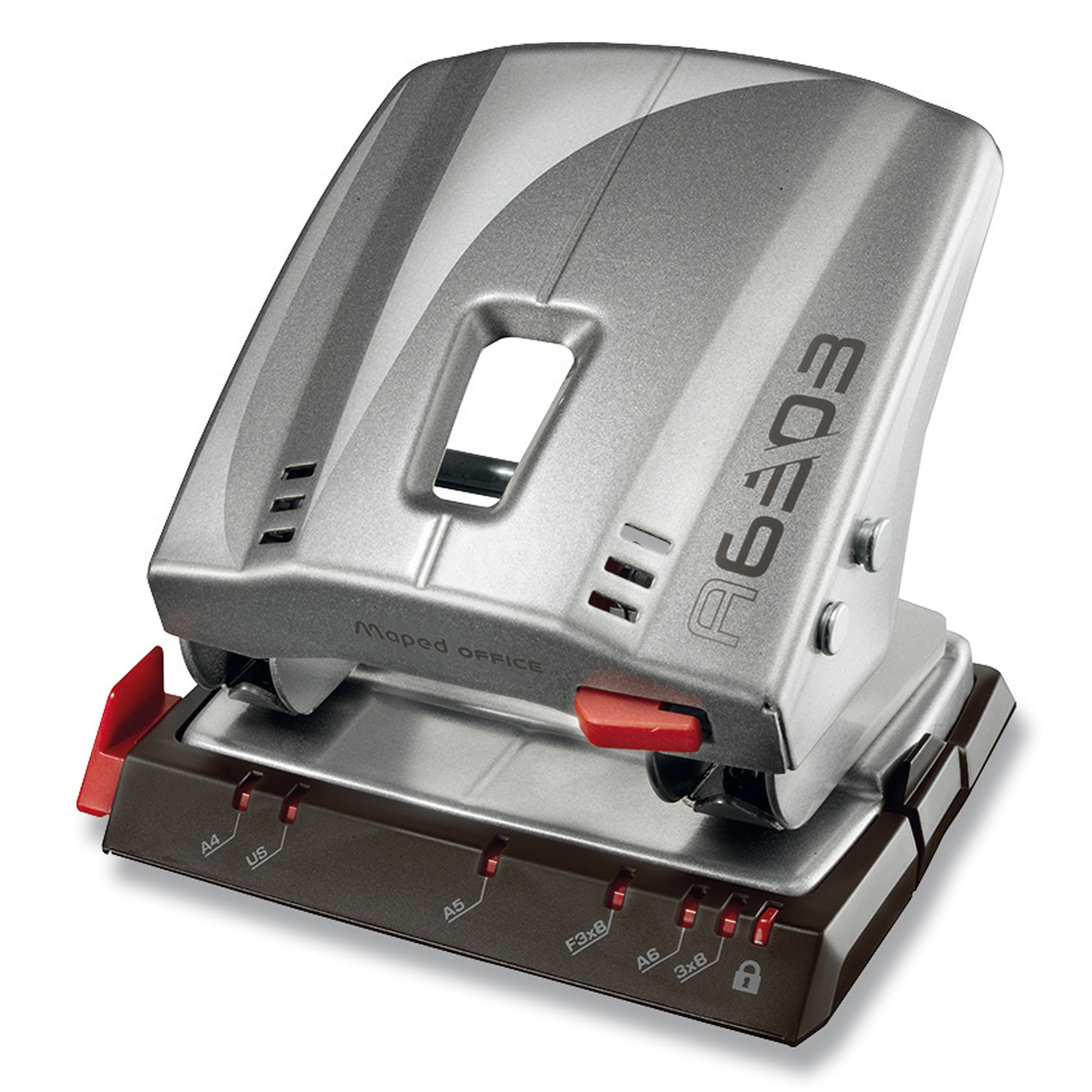 Celokovový výkonný dierovač na 40 listov 80g papiera. Príložník pre štandardné formáty A6, A5 a A4.
