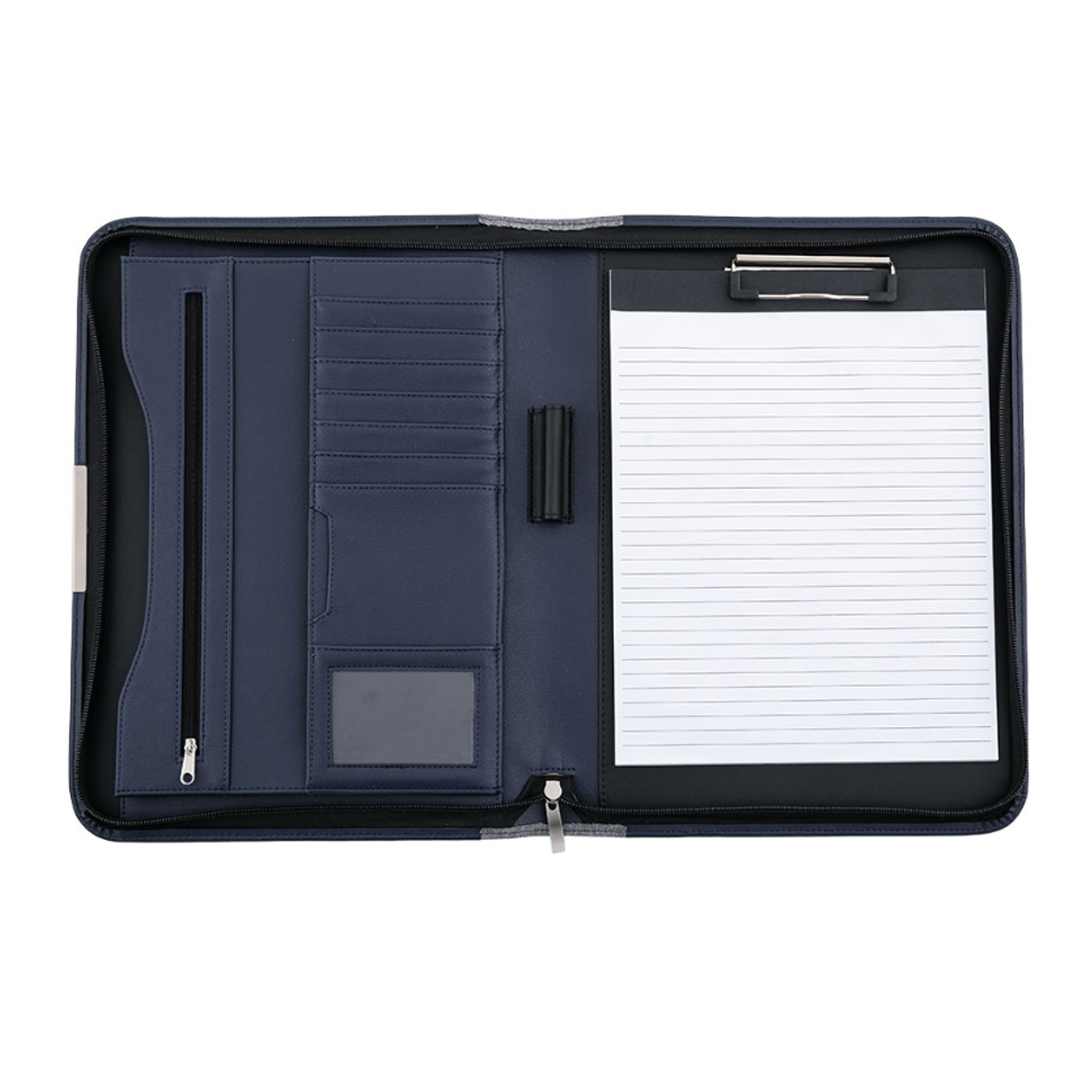 Konferenčná mapa s kovovým klipom navrhnutá pre praktickú organizáciu a prenos dokumentov. Vo vnútri je jedna veľká šitá priehradka na ktorom je veľké množstvo priehradiek a puzdier. Súčasťou je linkovaní vyberateľný poznámkový blok A4 na písanie. Šité puzdro na pero. Vonkajší povrch príjemný na dotyk je zmatnej fólie imitujúcej jemnú modrú kožu v kombinácii šedou textíliou. Obe materiály odolávajú odtlačkom prstov. Diplomatka po obvode je elegantne obšitá . Rozmery diplomatky sú 29,5 x 35 x 3,5cm, s hrúbkou chrbta 3,5 cm.