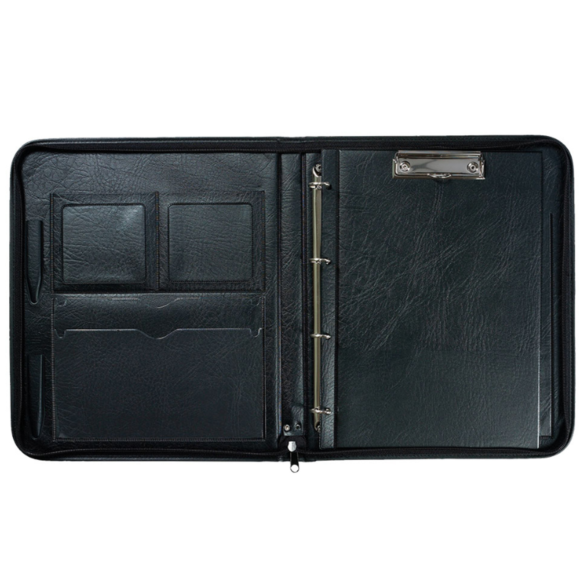 Konferenčná mapa A4 so 4-krúžkovou mechanikou. je navrhnutá pre praktickú organizáciu a prenos dokumentov. Vo vnútri sa nachádzajú dve menšie priesvitné záložky. a 3 veľké záložky na papiere formátu A4. Súčasťou je aj úchytka na písacie potreby a vyberateľná písacia podložka A5 s klipom s dvoma priesvitnými puzdrami na dokumenty. Vonkajší povrch diplomatky je z fólie imitujúcej čiernu kožu, ktorá odoláva odtlačkom prstov, a je elegantne obšitá po obvode. Rozmery diplomatky sú 29,5 x 35 x 3,5cm, s hrúbkou chrbta 3,5 cm.
