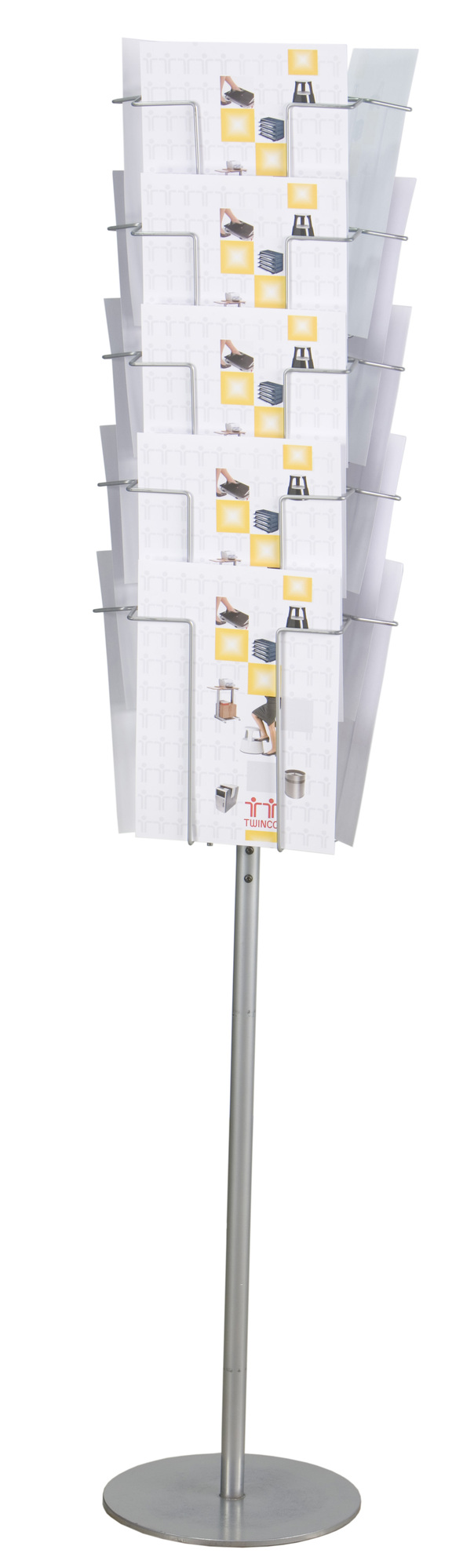 Celokovový otočný stojan na prospekty, katalógy formátu A4. Kapacita otočného stojana je 15 priehradiek, ktoré sú vyrobené z 4mm ocele. Povrchová úprava pálená strieborná prášková farba. Výška 148cm s priemerom 34cm.. Kovová základňa pr.28cm.
