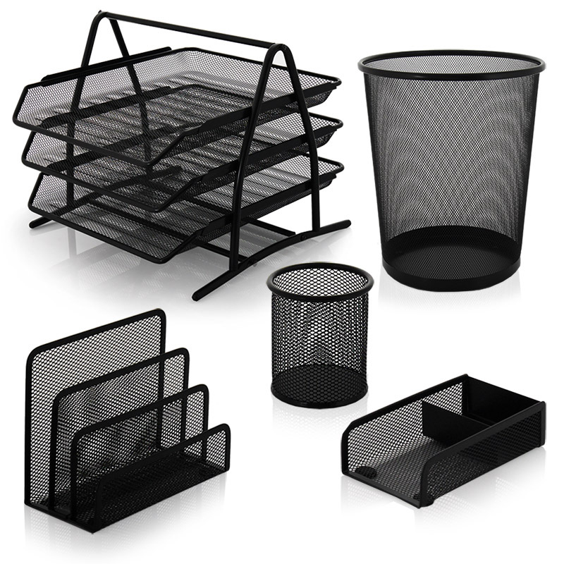 Obľúbená drôtená sada stolových stojanov. Kúpou tohto výhodného balenia kancelárskych organizérov ušetríte - stojan na spinky a poznámkové kocky je zdarma. Obsah balenia: 1x stojan na písacie potreby, 1x stojan na samolepiacu poznámkovú kocku + spinky, 1x odkladač 3 posch., 1x smetný kôš a 1x organizér s priehradkami. Povrchová úprava čierna pálená farba.
