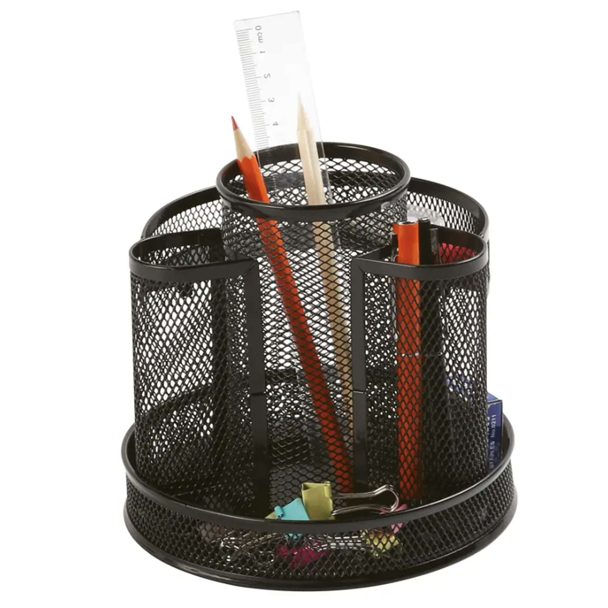 Stolový rotačný organizér s 4 priehrady na písacie a kancelárske potreby. 1 priehradka na drobnosti ako listové spony atď. Vďaka možnosti otáčania má ľahký prístup z každej strany. Povrchová úprava čierna pálená farba. Rozmery (š × v × h) 165 × 165 × 160 mm. Farba čierna.
