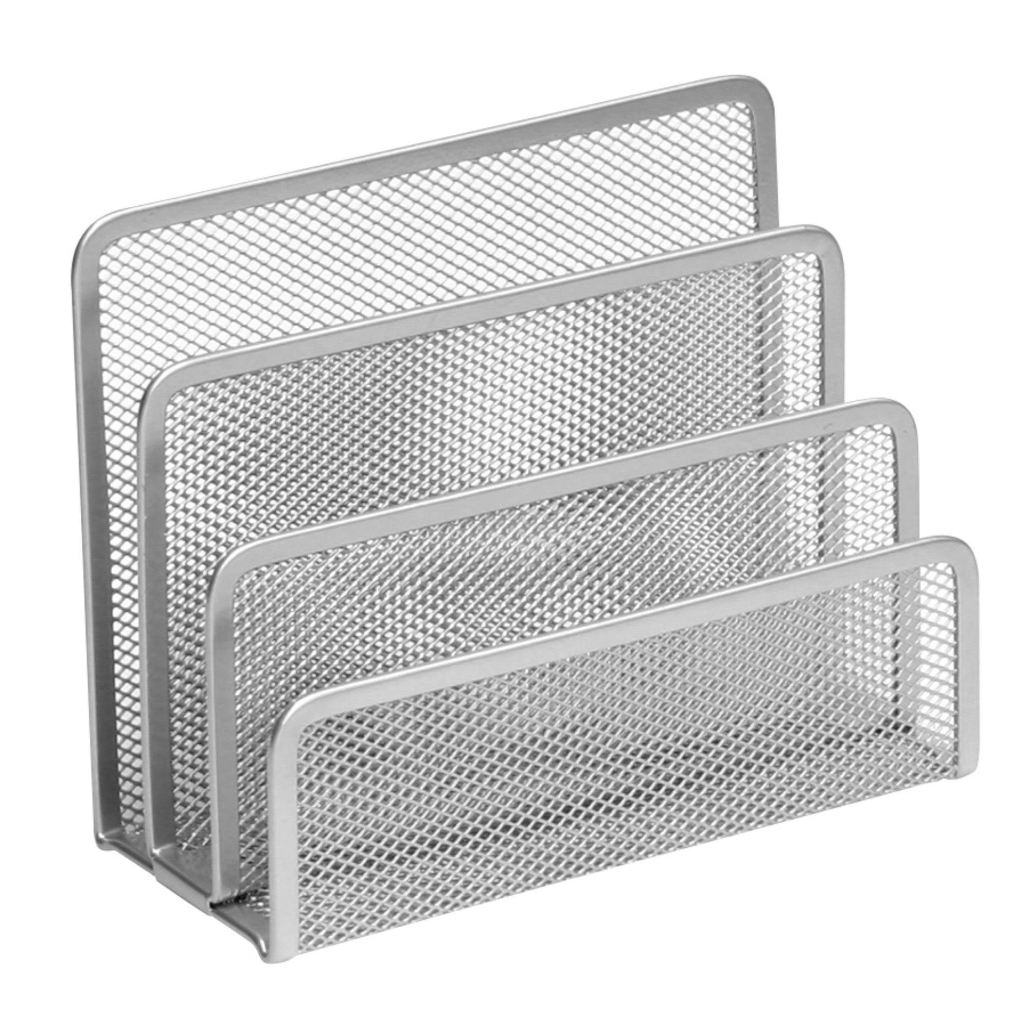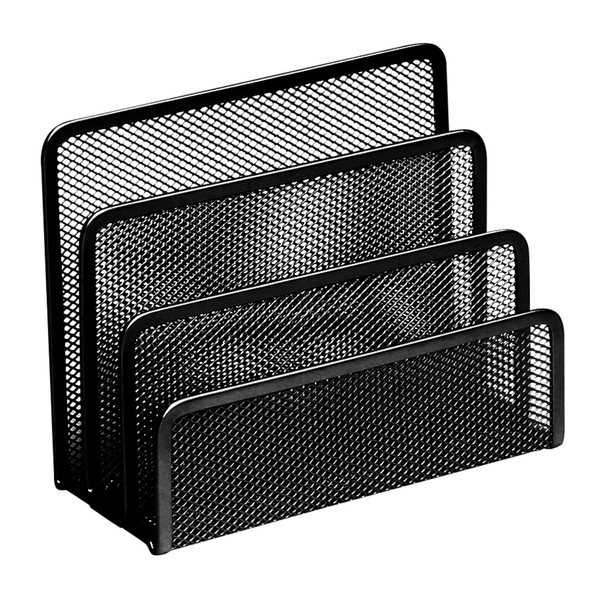 Kovový stolový organizér na usporiadanie pracoviska. Má 2 vertikálne priehradky na písacie potreby a 2 priehradky na drobné kancelárske doplnky ako sponky atď. záložky. Vyrobené z kovovej sieťoviny pokrytej čiernym pálenou farbou. Rozmery: 154 x 103 x 103 mm