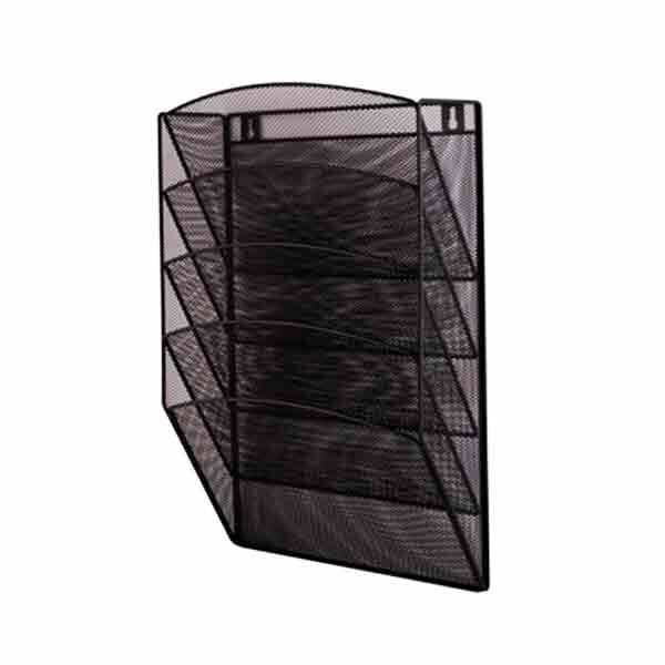 Závesný kovový organizér s 5 priehradkami pre formát A4. Povrchová úprava čierna pálená farba. Rozmery: 435 x 315 x 110 mm.