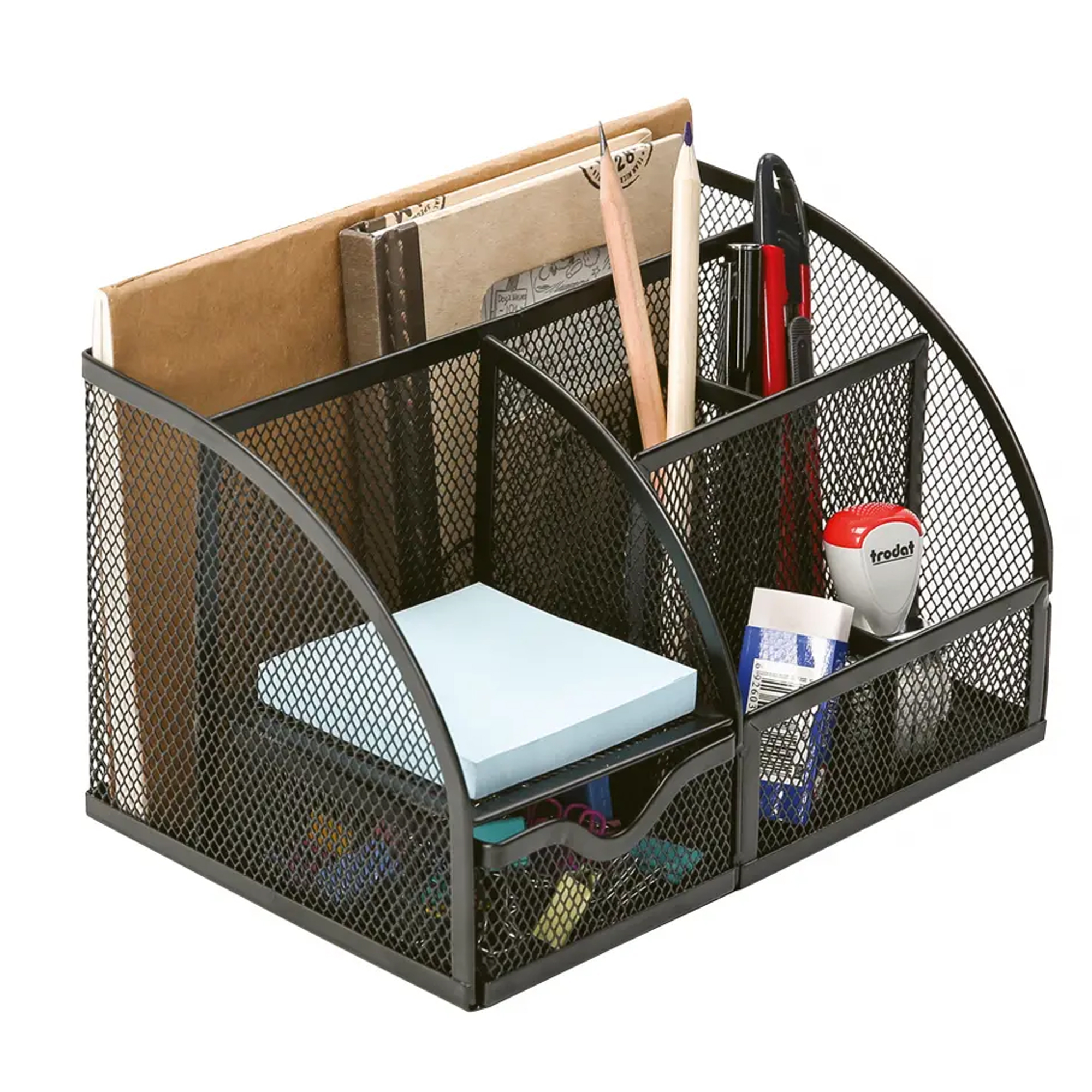 Kovový stolový organizér na usporiadanie pracoviska. Má 2 vertikálne priehradky na písacie potreby a 2 priehradky na drobné kancelárske doplnky ako sponky atď. záložky. Vyrobené z kovovej sieťoviny pokrytej čiernym pálenou farbou. Rozmery: 154 x 103 x 103 mm