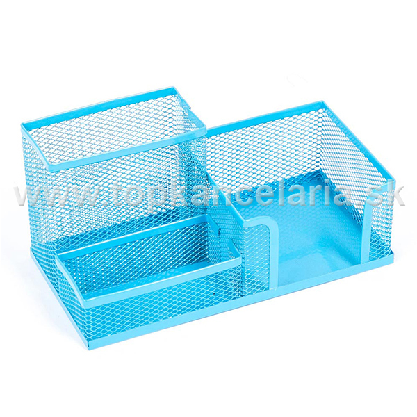 Stolový kovový organizér s 3 priehradkami pre písacie potreby, poznámkovu kocku a drobnosti ako listové spony atď. Povrchová úprava svetlomodrá pálená farba. Rozmery: 205 x 103 x 98 mm.