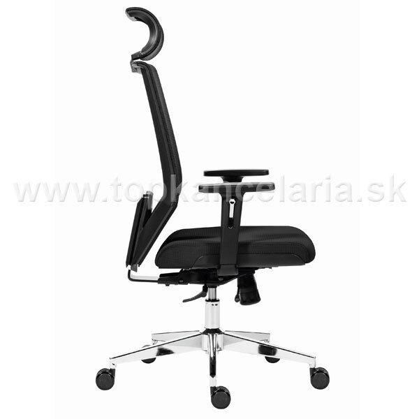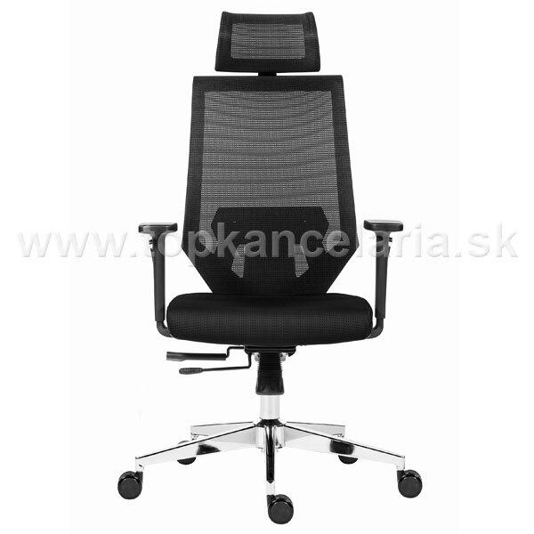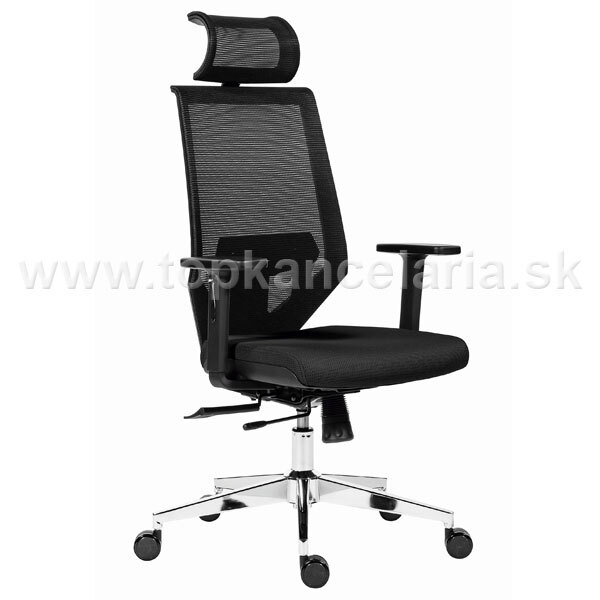 Kancelárska stolička s uhlovo nastaviteľným podhlavníkom. Výškovo nastaviteľné operadlo je vyrobené z pevnej čiernej sieťoviny, ktorá je naviac vybavená aj s výškovo nastaviteľnou bedrovou opierkou. Synchrónny mechanizmus s možnostou nastavenia protiváhy s niekoľkonásobnou aretáciou. Pochrómovaný kovový kríž s univerzálnimy kolieskami pr.60 mm pre všetky povrchy Kancelárska stolička je vybavená s posuvným sedákom, výškovo nastaviteľnímy podrúčkami s mäkkou dotykovou plochou. Nosnosť 130 kg.