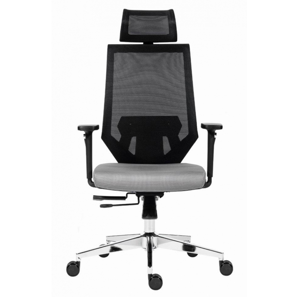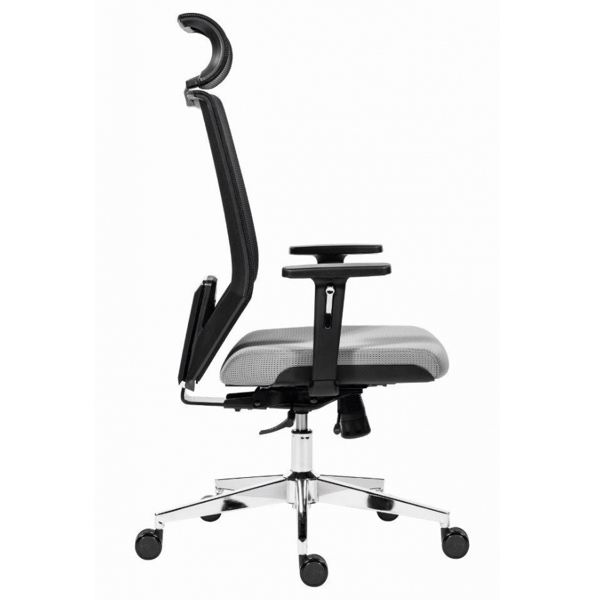Kancelárska stolička s uhlovo nastaviteľným podhlavníkom. Výškovo nastaviteľné operadlo je vyrobené z pevnej čiernej sieťoviny, ktorá je naviac vybavená aj s výškovo nastaviteľnou bedrovou opierkou. Synchrónny mechanizmus s možnostou nastavenia protiváhy s niekoľkonásobnou aretáciou. Pochrómovaný kovový kríž s univerzálnimy kolieskami pr.60 mm pre všetky povrchy Kancelárska stolička je vybavená s posuvným sedákom, výškovo nastaviteľnímy podrúčkami s mäkkou dotykovou plochou. Nosnosť 130 kg.