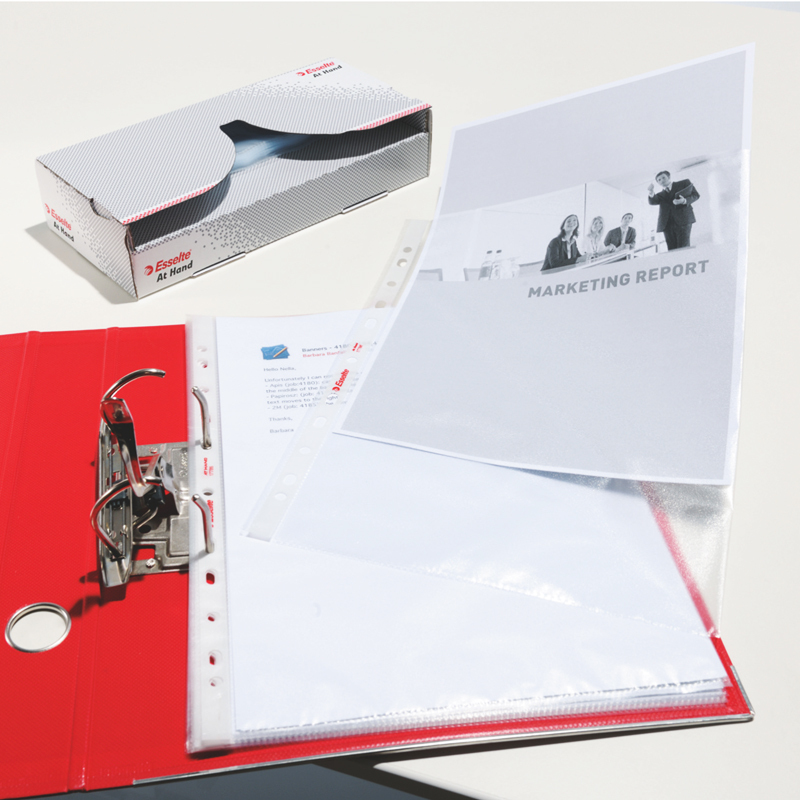 Závesné prospektové obaly Esselte A4 s bočnou chlopňou na pravej strane obalu. Ľahký prístup k dokumentom s dlhou otvorenou pravou stranou ktorá je zároveň plne chránená s chlopňou. Multiperforácia na ukladanie do krúžkových a pákových zakladačov. Embosovaný matný povrch, hrúbka 100mic. Balenie sáčok 10ks. Formát A4