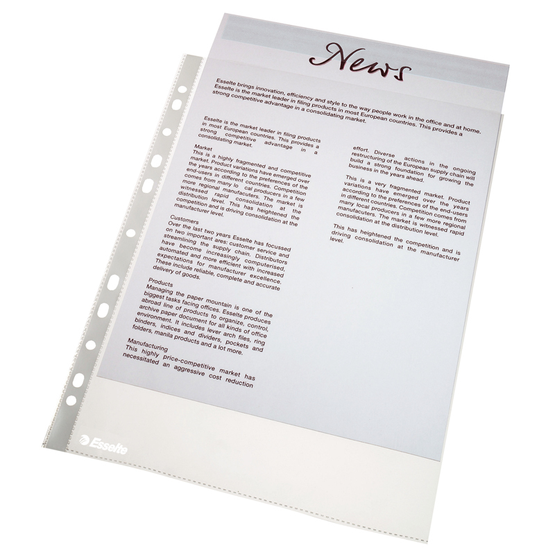 Závesné prospektové obaly Esselte A4 s bočnou chlopňou na pravej strane obalu. Ľahký prístup k dokumentom s dlhou otvorenou pravou stranou ktorá je zároveň plne chránená s chlopňou. Multiperforácia na ukladanie do krúžkových a pákových zakladačov. Embosovaný matný povrch, hrúbka 100mic. Balenie sáčok 10ks. Formát A4