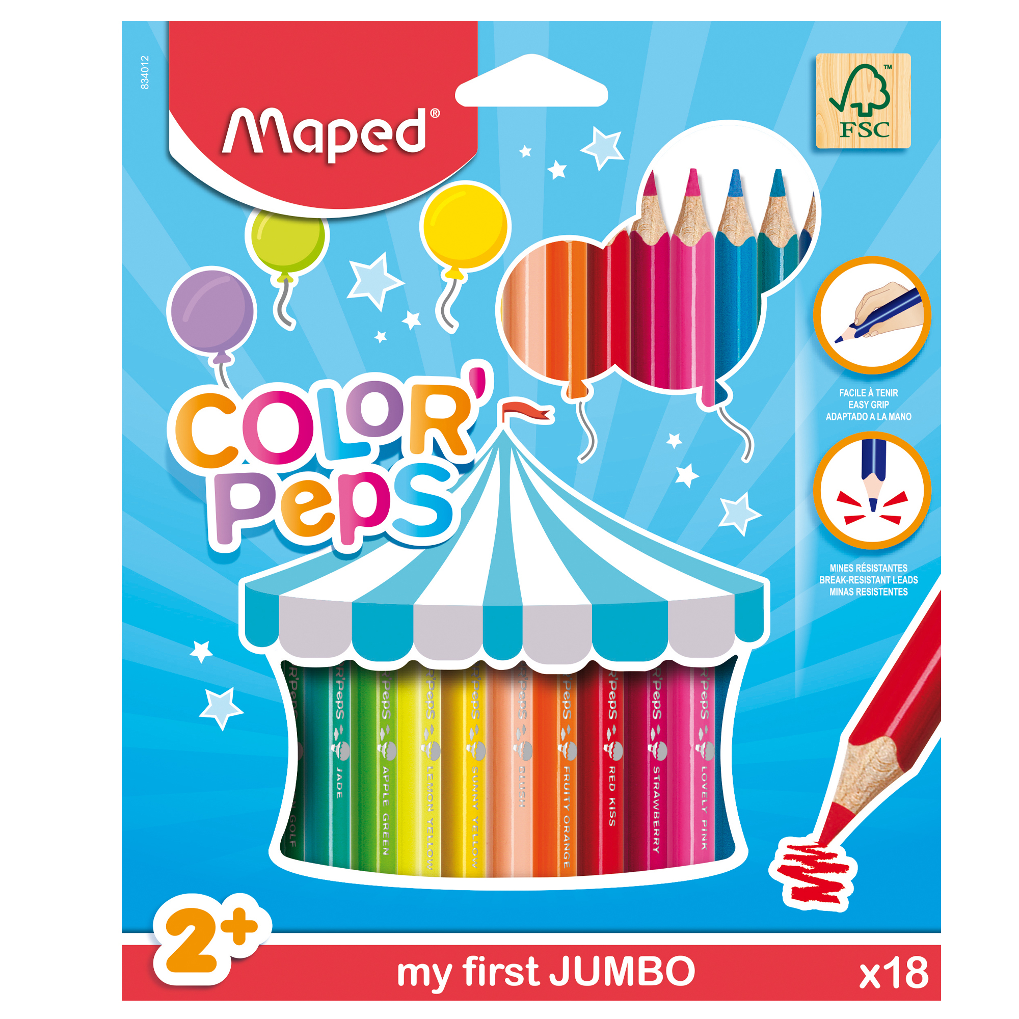 Súprava 18 kusov hrubých farebných ceruziek Color Peps v papierovom puzdre je určená pre deti od 2 rokov. Tieto ceruzky majú trojhranné telo, čo zvyšuje pohodlie pri kreslení a minimalizuje únavu ruky. Ich mäkká a odolná tuha umožňuje plynulé a presné kreslenie, pričom farby sú jemné a primerané pre malé deti.