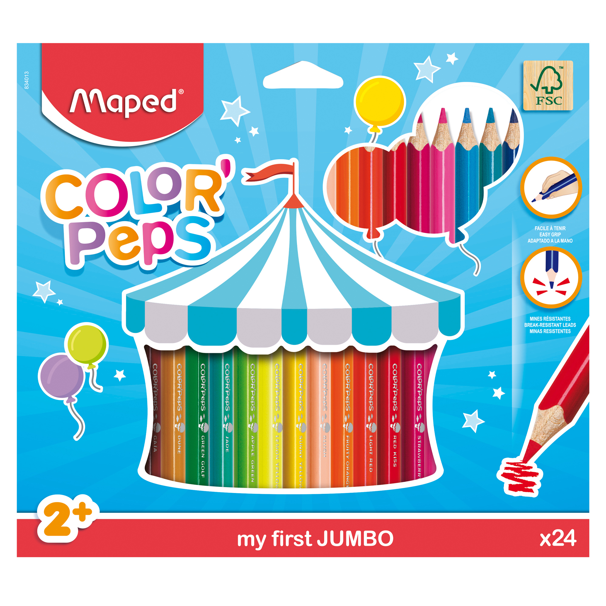Súprava 24 kusov hrubých farebných ceruziek Color Peps v papierovom puzdre je určená pre deti od 2 rokov. Tieto ceruzky majú trojhranné telo, čo zvyšuje pohodlie pri kreslení a minimalizuje únavu ruky. Ich mäkká a odolná tuha umožňuje plynulé a presné kreslenie, pričom farby sú jemné a primerané pre malé deti.