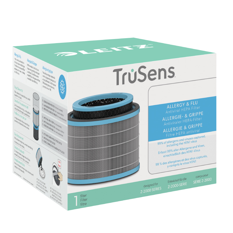 Antialergénny HEPA filter do čističky vzduchu Leitz Trusen Z-2000. Najlepší filter proti alergiám a chrípkovým ochoreniam. Filter 3 v 1 kombinovaný na alergie a vírusy je zložený z 3 vrstiev – odolný predfilter, antivírusový HEPA filter a uhlíková vrstva ktorá redukuje pach a prchavé plyny. 360° filtrácia nasáva vzduch zo všetkých strán a tak zachytí až 99,97% alergénov a vírusov vr. chrípkového vírusu H1N1 z celej miestnosti. HEPA filter s antivírusovým povlakom má účinnosť zachytávania škodlivých mikročastíc (od 0,3 mikrónu) až 99,97 %.