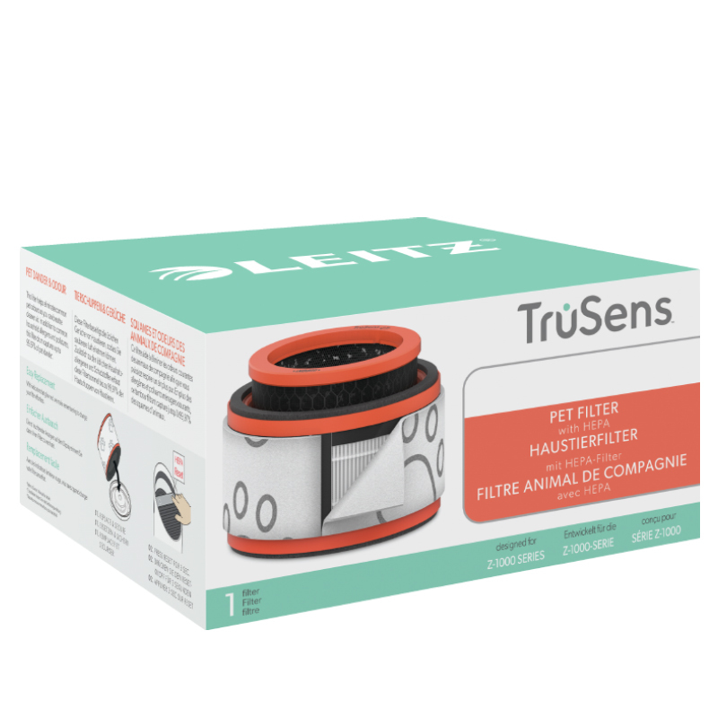 Náhradný HEPA filter 3 v 1 do prostredia s domácimi zvieratami pre čističku vzduchu Z-1000 ktorá pomáha eliminovať nečistoty a pachy zvierat. Tento kombinovaný filter má 3 úrovne filtrácie vyvinuté špeciálne na elimináciu zvieracích pachov, chlpov a prachu. 360-stupňová filtrácia nasáva vzduch zo všetkých smerov a zachytáva znečisťujúce látky z celej miestnosti. Systém filtra všetko v jednom (all-in-one) kombinuje umývateľný predfilter, filter HEPA a dvojvrstvový uhlíkový filter. Okrem bežných domácich alergénov a znečisťujúcich látok zachytáva tento filtračný bubon najmä 99,97 % vzdušných nečistôt od domácich zvierat. Filtračný bubon je centrálnym miestom čistenia vzduchu. Pre spoľahlivé fungovanie čističky vzduchu odporúčame vymieňať filtračný HEPA bubon každých 12 mesiacov (v závislosti od používania). Kompatibilný so všetkými čističkami vzduchu Leitz TruSens Z-1000.