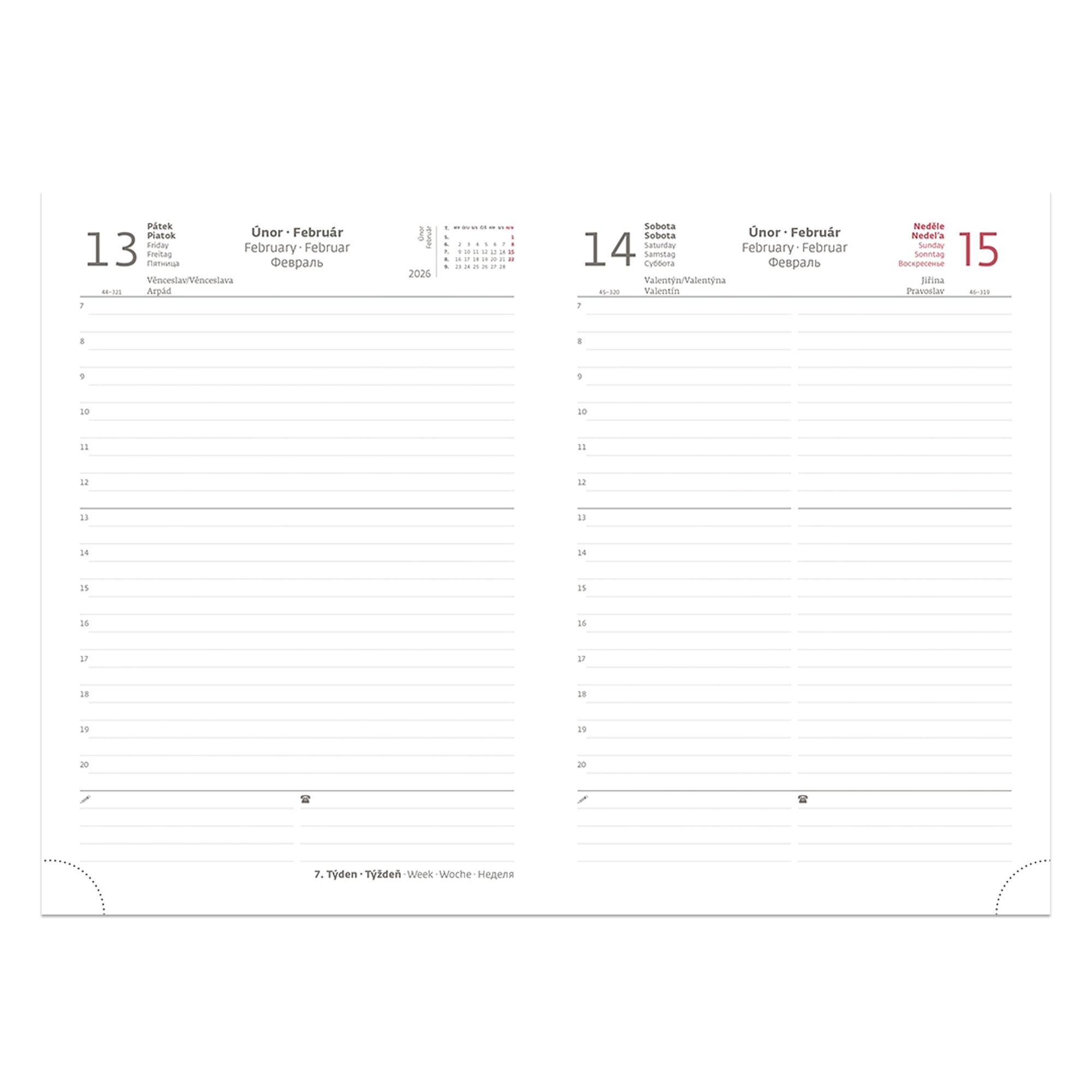 Diár obsahuje: osobné údaje, plánovač dovolenky (mesačný prehľad), plánovací kalendár, telefónne predvoľby, štátne sviatky Českej a Slovenskej republiky, medzinárodné sviatky, ročný výhľad, denný layout, adresár, mapa Európy a Českej a Slovenskej republiky