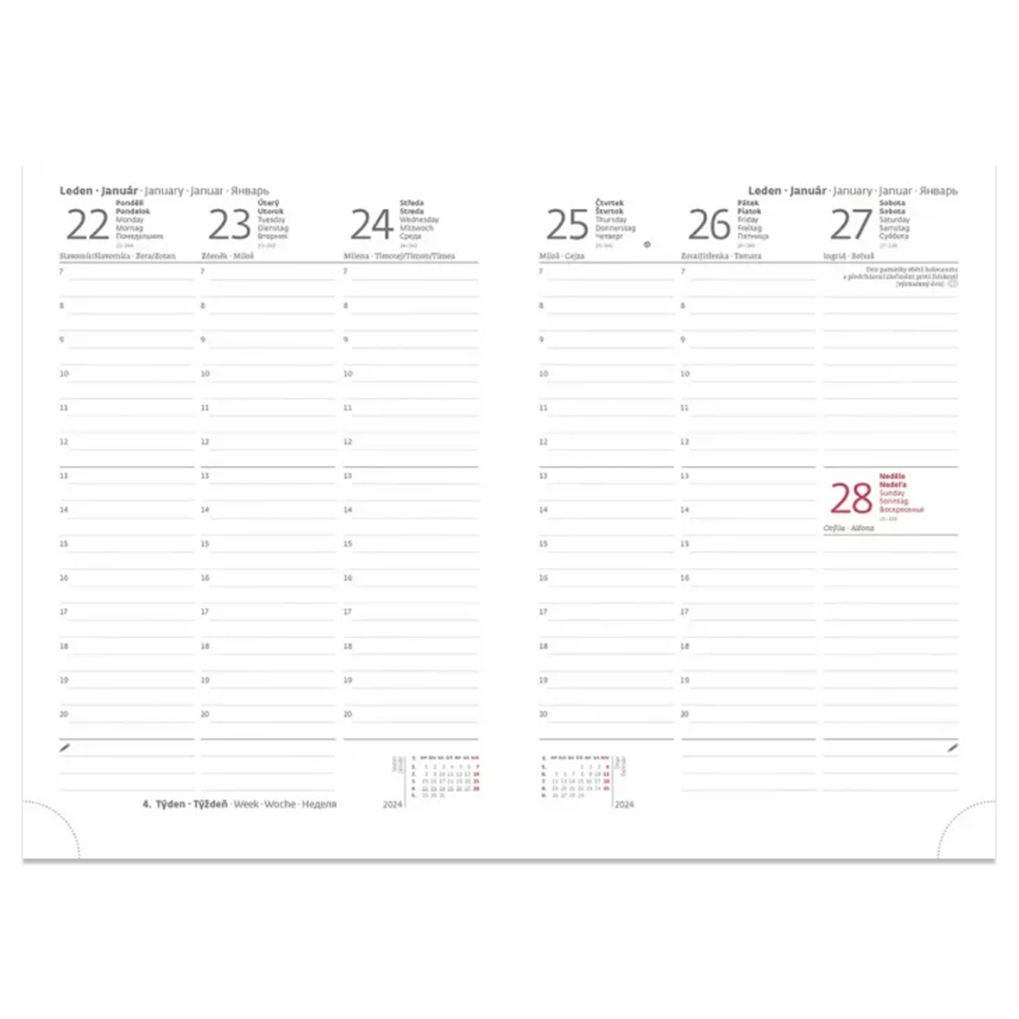 Týždenný diár. Na dotyk príjemná matná koženka predstavuje kvalitný, a zároveň veľmi obľubený materiál. Hrúbka materiálu umožňuje dosiahnuť perfektné výsledky pri razbe bez fólie. Diár obsahuje: osobné údaje, plánovač dovolenky (mesačný prehľad), plánovací kalendár, telefónne predvoľby, štátne sviatky Českej a Slovenskej republiky, medzinárodné sviatky, ročný výhľad, denný layout, adresár. Rozmer 14,5 x 20,5cm. 128 strán.