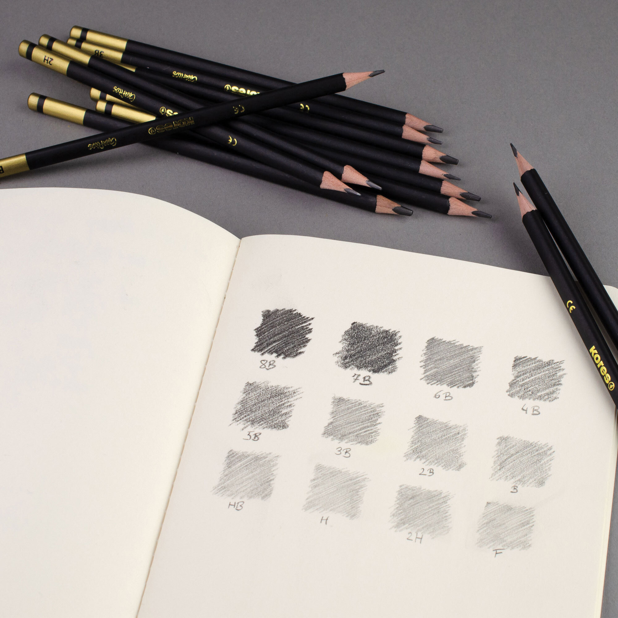 Súprava obsahuje ceruzky tvrdosťi 8B, 7B, 6B, 5B, 4B, 3B, 2B, B, HB, F, H a 2H