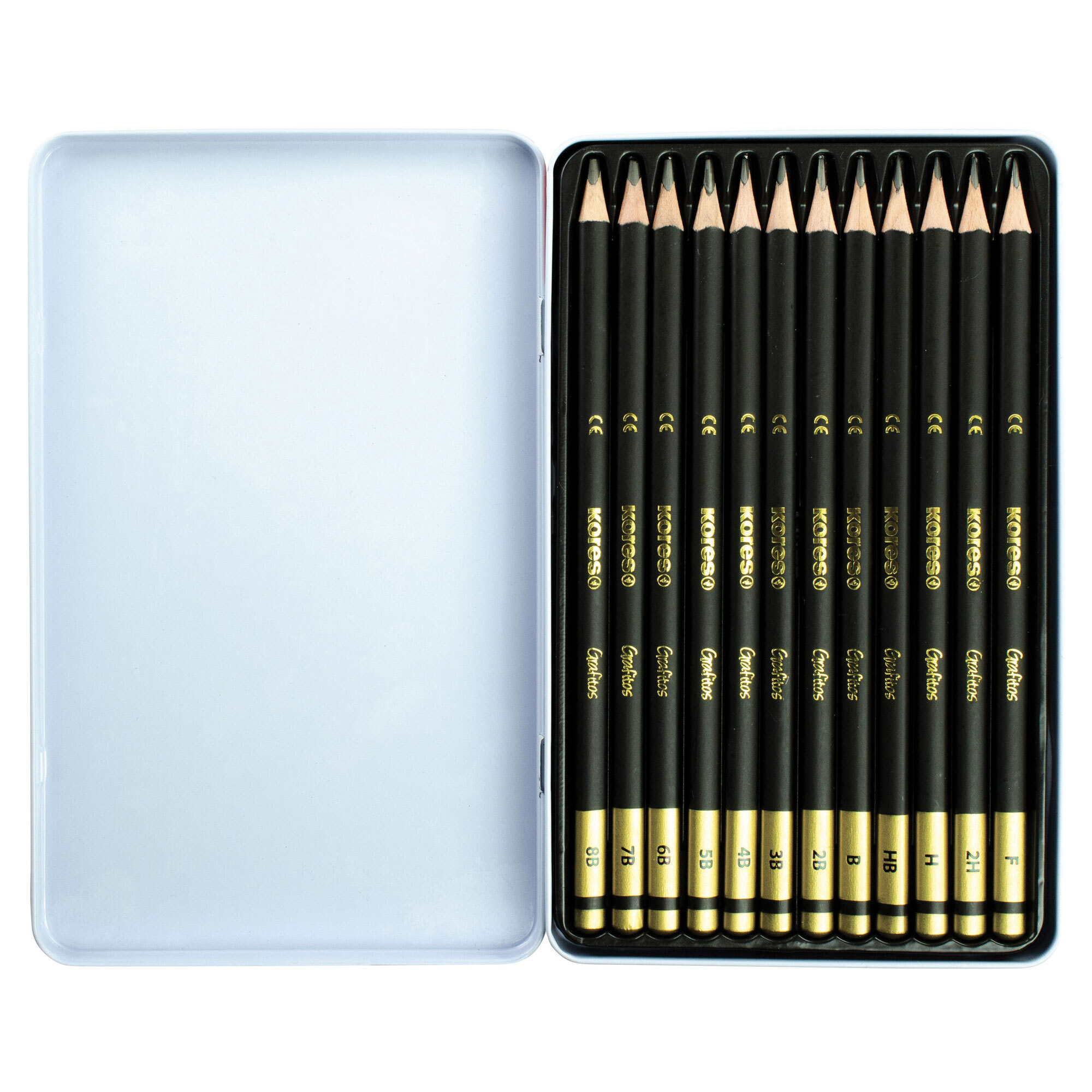 Súprava vysoko kvalitných trojhranných grafitových ceruziek Kores Grafitos je ideálnou voľbou pre pohodlné písanie, skicovanie a kreslenie. Ceruzky majú elegantné matné čierne telo s metalicky zlatým koncom, ktoré im dodáva štýlový a profesionálny vzhľad. Ich ergonomický trojhranný tvar zabezpečuje komfortný úchop a pohodlné používanie aj pri dlhšom písaní či kreslení. Sú dodávané v praktickom kovovom puzdre s plastovým zakladačom, ktoré poskytuje bezpečné uloženie a jednoduchú organizáciu. Perfektné pre školákov, študentov, umelcov aj profesionálov. Súprava obsahuje ceruzky tvrdosťi 8B, 7B, 6B, 5B, 4B, 3B, 2B, B, HB, F, H a 2H