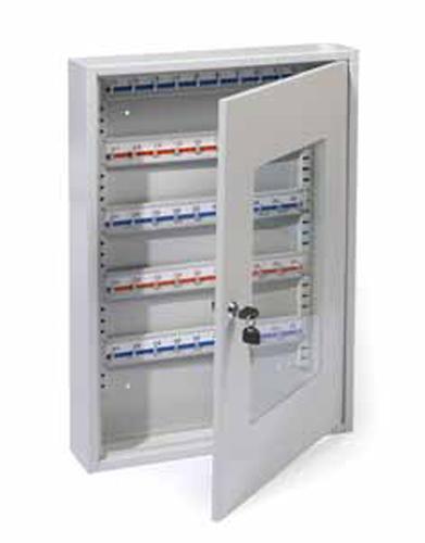 Uzamykateľná skrinka na 50 kľúčov, vyrobená z pevnej ocele. Predná strana číre sklo. Súčasťou balenia je aj 60 plastových menoviek na kľúče. Rozmer: 550x380x80mm