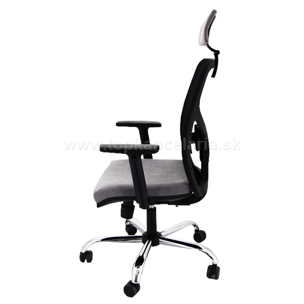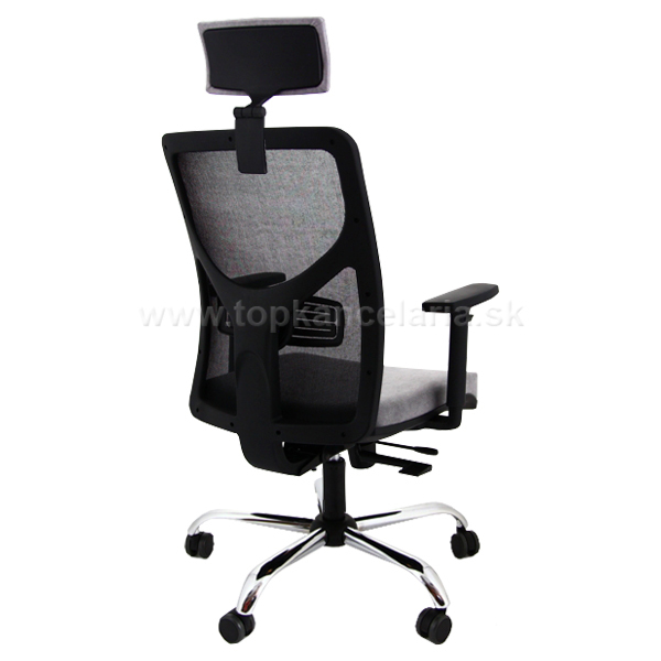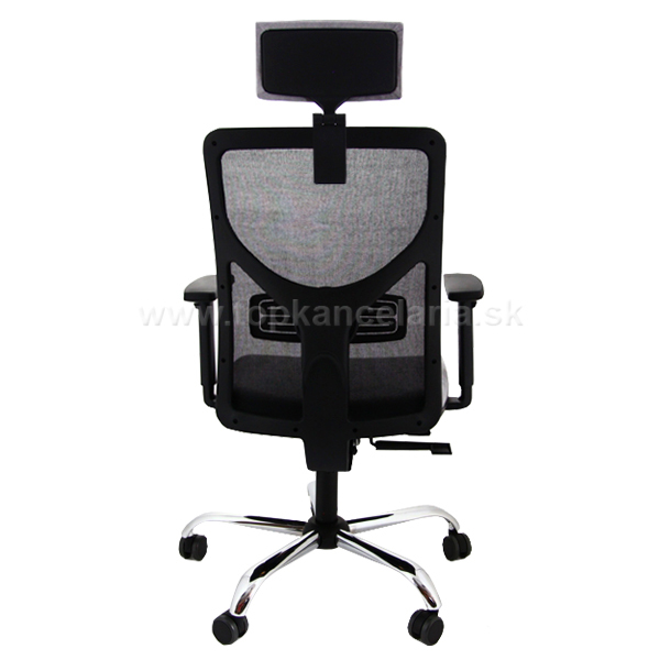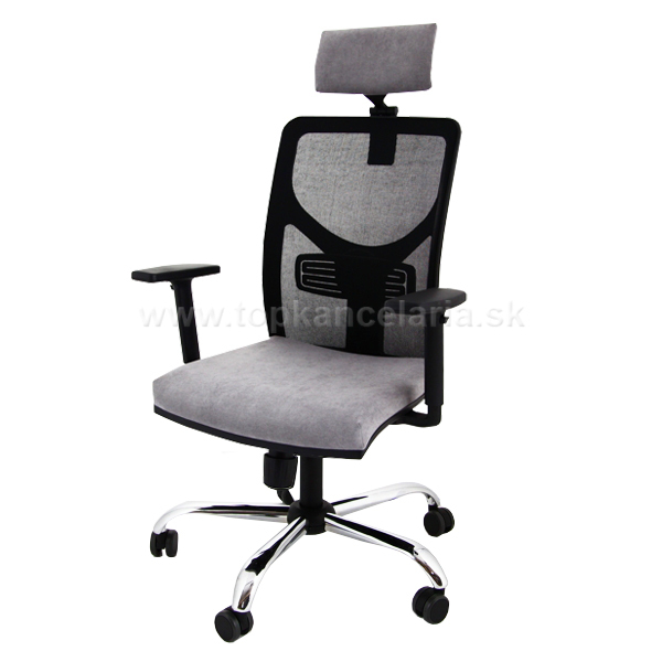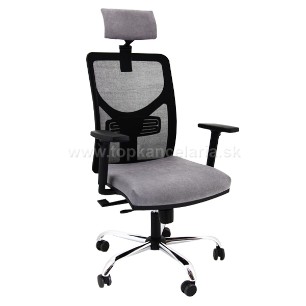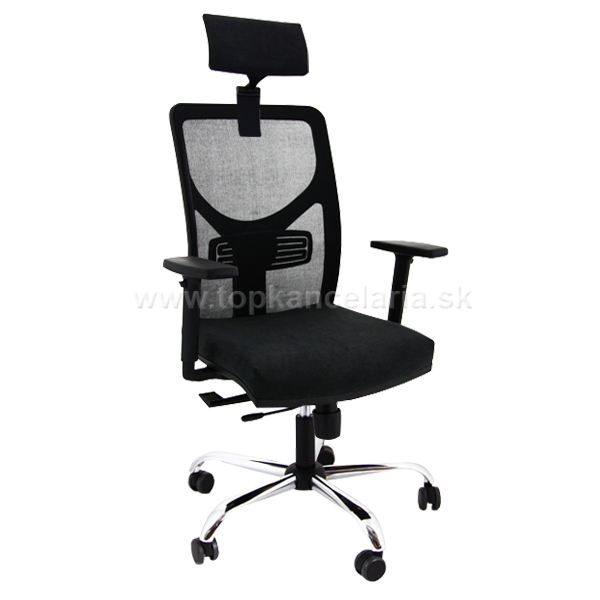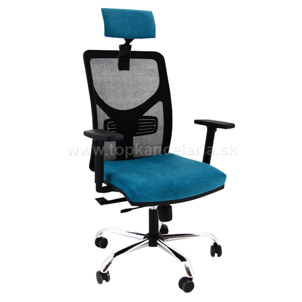 Kancelárska stolička s chrómovým krížom, s veľkými pogumovanými kolesami pr. 60mm, s výškovo nastaviteľnými podrúčkami a s podhlavníkom.