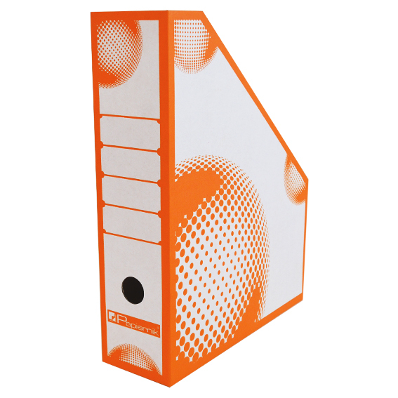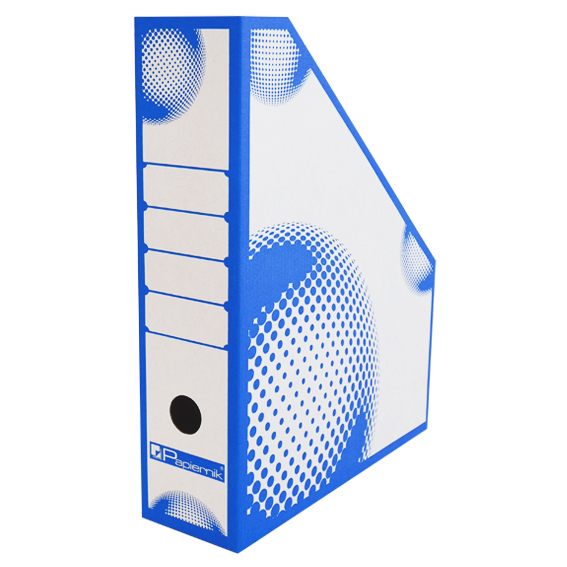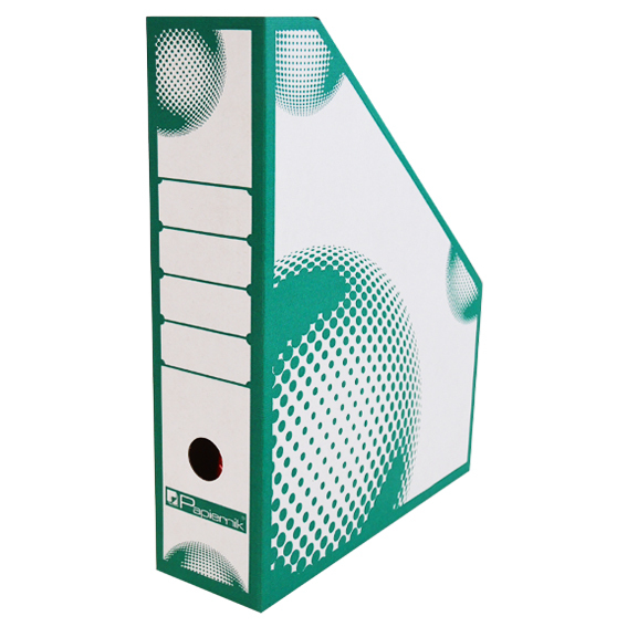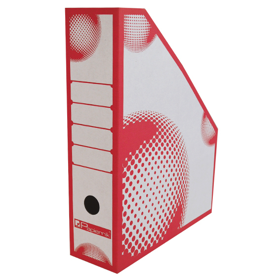 Pevný papierový stojan na časopisy vyrobený z lakovaného kartónu. Je určený najme na ukladanie časopisov, katalógov, cenníkov a pod., do formátu A4. Má hladký lakovaný povrch. Je ľahko zostaviteľný. Pre jednoduchšie uchopenie v chrbte má vyrezaný otvor. Šírka chrbta 80 mm. Väčšie balenie 10 ks