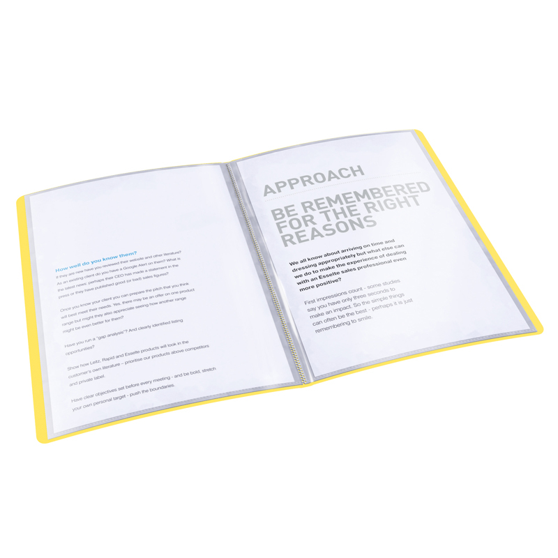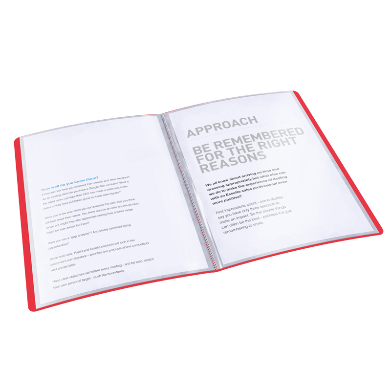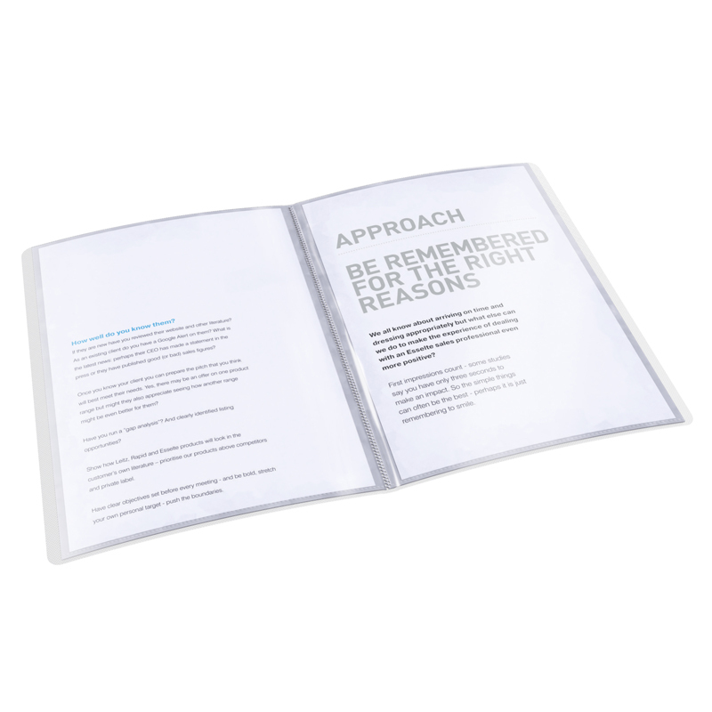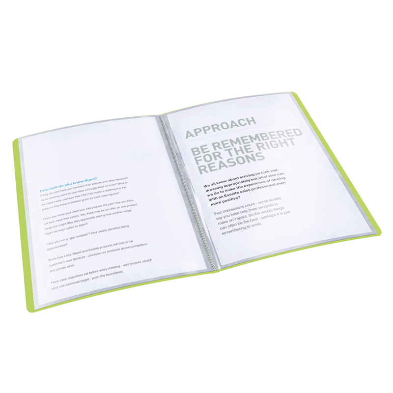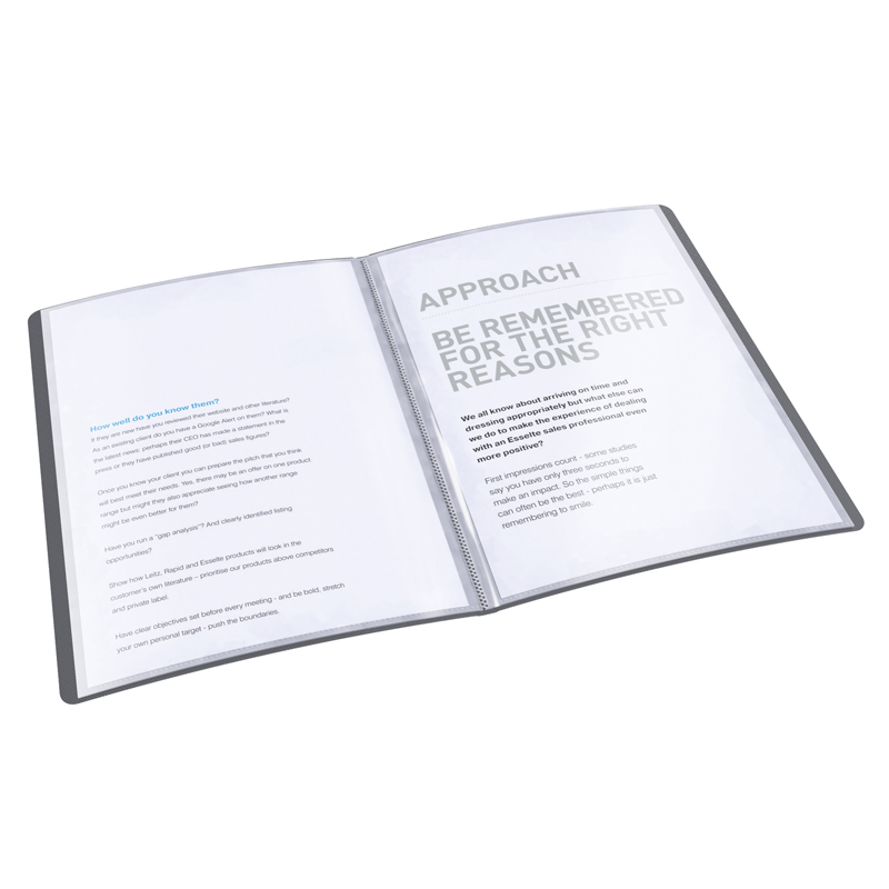 Katalógová kniha s 40 vreckami v mäkkom čiernom obale v štvorčekovanom designe Esselte VIVIDA na prezentácie alebo ukladanie dokumentov. Do predného obalu je možné vložiť titulnú stranu formátu A4. Má 40 integrovaných obalov pre prezentáciu 80 dokumentov A4. Kapacita: 80 listov formátu A4 (80 g/m2), 2 listy / 1 obal. Samolepiaci popisovateľný chrbtový štítok. Katalógovú knihu je možné kombinovať s ostatnými výrobkami z radu Esselte VIVIDA. Rozmery: 17 x 310 x 231 (mm)