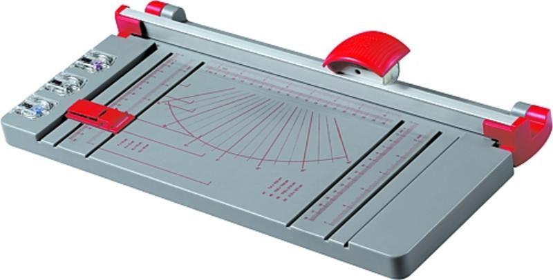 Kotúčová rezačka s ľahko vymeniteľnými nožmi v plastových kazetách, ktoré sú uložené v pracovnej doske. Kovová vodiaca lišta pri rezaní zároveň fixuje papier. Pracovná doska je označená v cm / inches a pomocnými čiarami. Rezné kotúče pre perforovaný, vlnitý a rovný rez. Reže maximálne 10 hárkov papiera formátu A4.