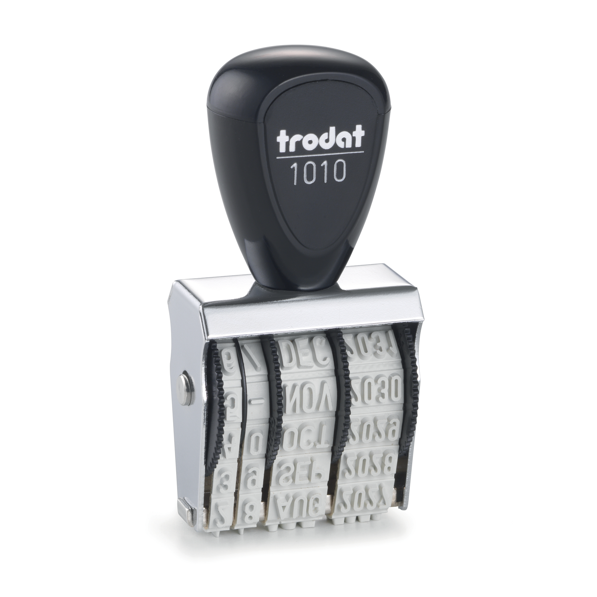 Plastová samofarbiaca pečiatka. - Výška dátumu: 3,8 mm - Typ odtlačku: 12-AUG-2005 - Možné farby odtlačku: Čierna, modrá, červená, zelená, fialová - Náhradná poduška: 6/4910 - Balenie: 10 ks