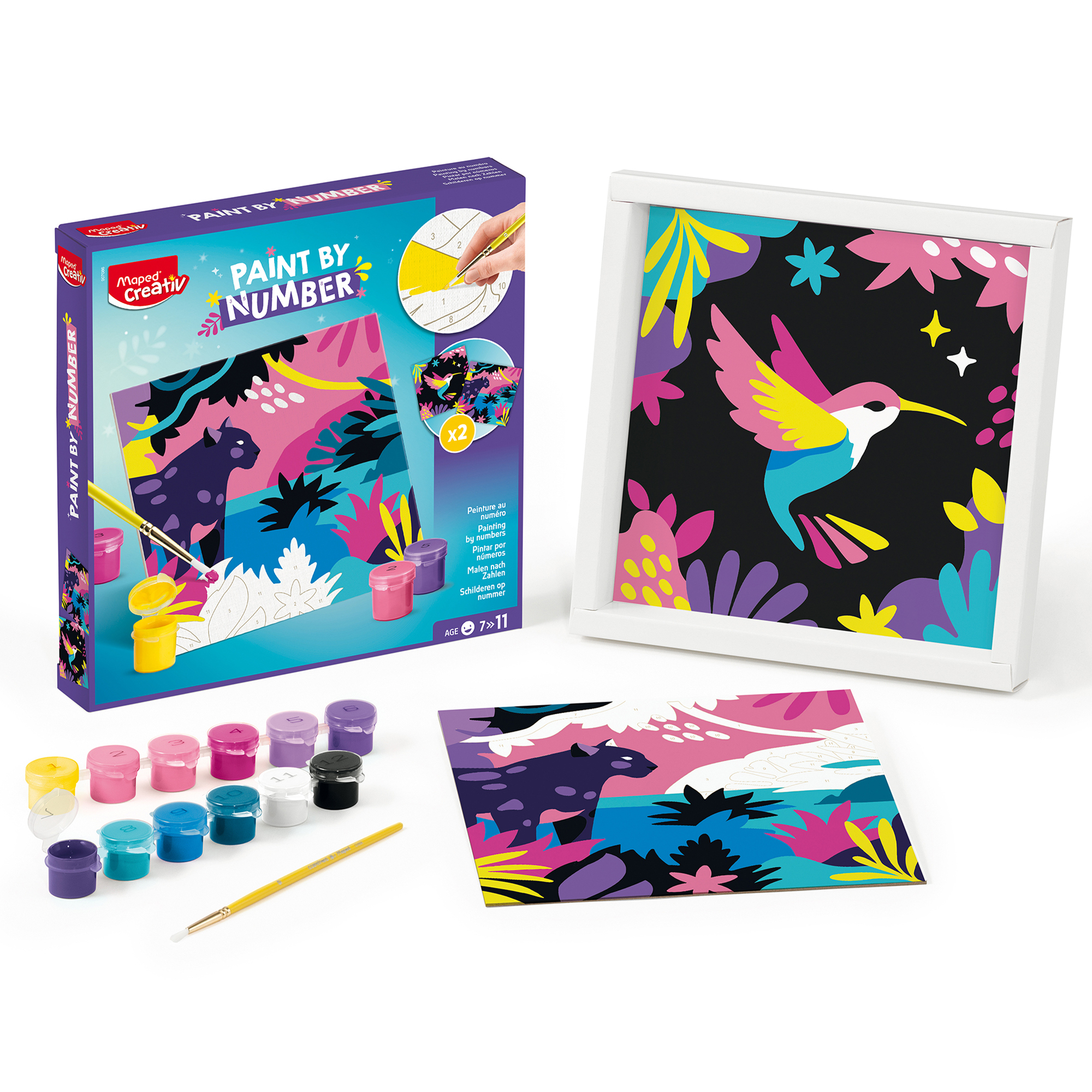 S kreatívnou sadou Maped Creativ Paint by Number si deti môžu vytvoriť vlastné umelecké diela s exotickými motívmi leoparda a vtáka. Technika maľovania podľa čísel je jednoduchá a zábavná – každé číslo na šablóne zodpovedá konkrétnej farbe, vďaka čomu môžu aj začínajúci umelci dosiahnuť skvelé výsledky.