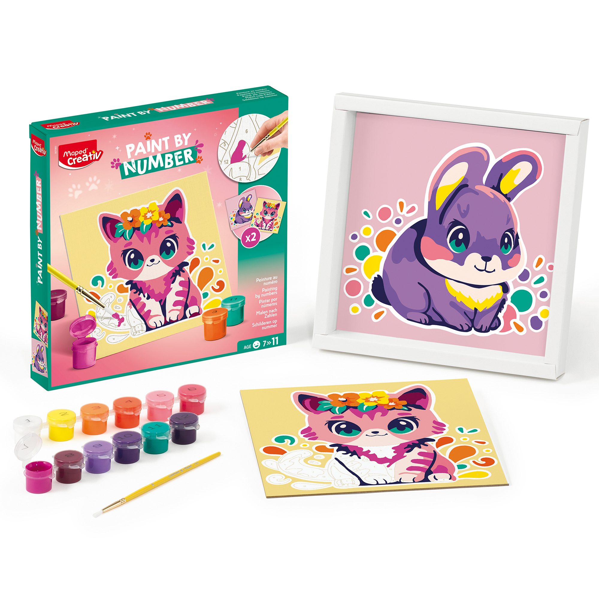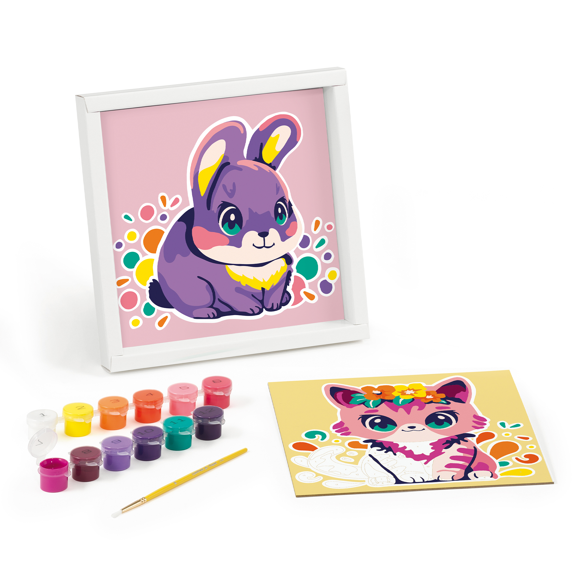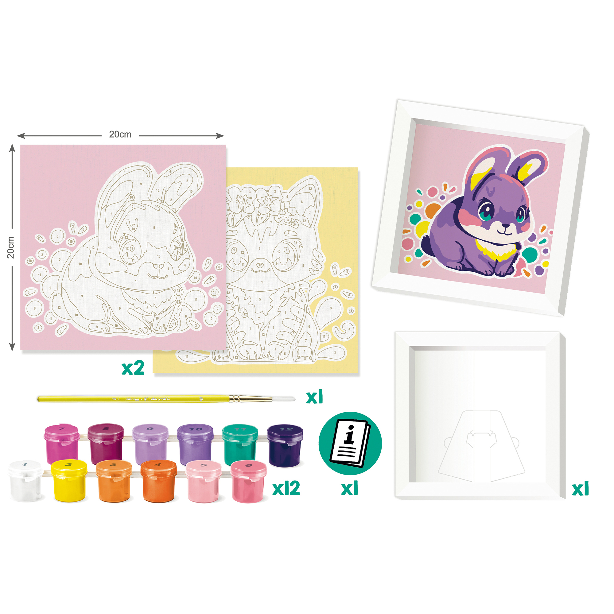 Obsahuje 2 šablóny s motívmi mačky a králika (20 × 20 cm), 12 nádobiek s akrylovými farbami, štetec a rámček, do ktorého si hotové dielo môžu deti hrdo vystaviť. Maľovanie podľa čísel je jednoduché a zábavné – stačí vybrať farbu podľa čísla a vyfarbiť príslušné políčko.