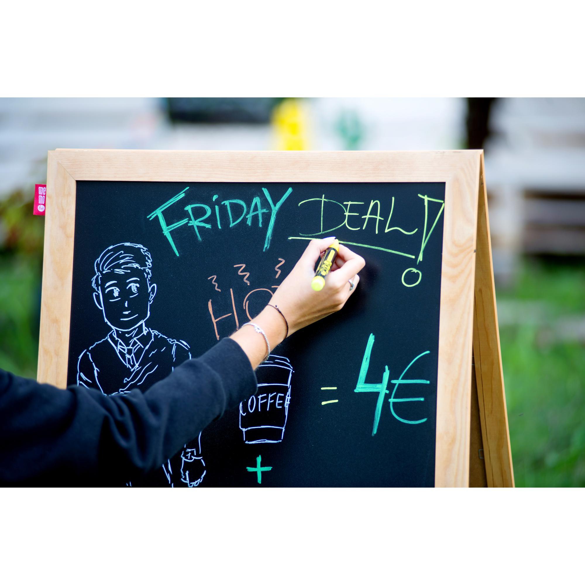 Kvalitný kriedový popisovač s 7 x 10mm hrotom. Ideálne na vytváranie pútavých a propagačných oznámení. Používa sa v reštauráciách na písanie jedálnych lístkov, v obchodoch na informovanie o akciách, v predajniach áut na písanie informácií o cenách. Možno zmyť vodou, napríklad tradičnou špongiou. Vybavený klipom na uzávere, ktorý umožňuje pripevnenie na vrecko alebo notebook.