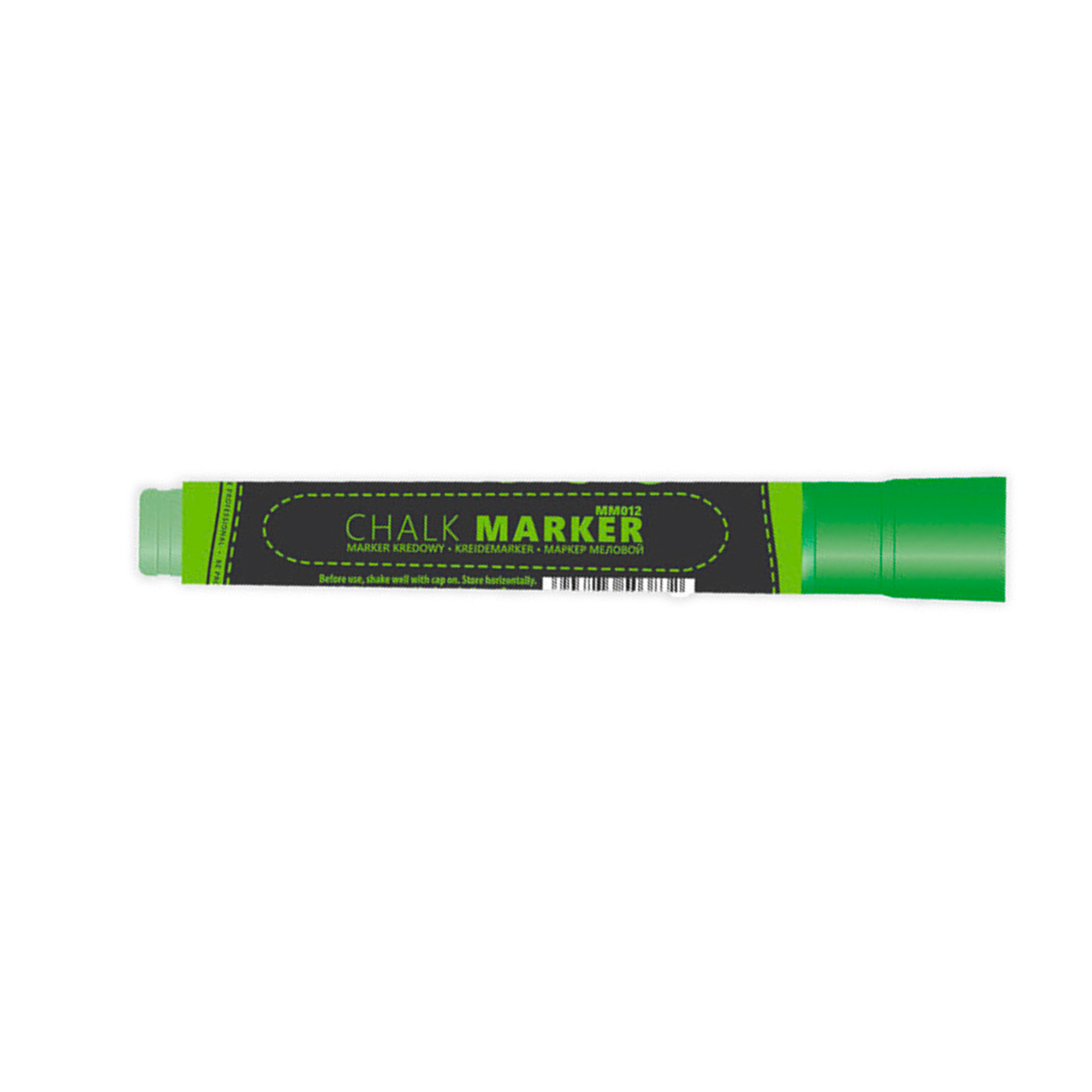 Špeciálny popisovač na okná, zrkadlá. Používa sa na informatívne a reklamné nápisy najmä na sklách výkladov. Tekutá krieda na vodnej báze so silnými krycími schopnosťami, odoláva UV žiareniu. Odstraňuje sa bežným umývaním, zotrením. Zrezaný hrot, šírka stopy 2 - 15 mm Farba: zelená Balenie: 1 ks