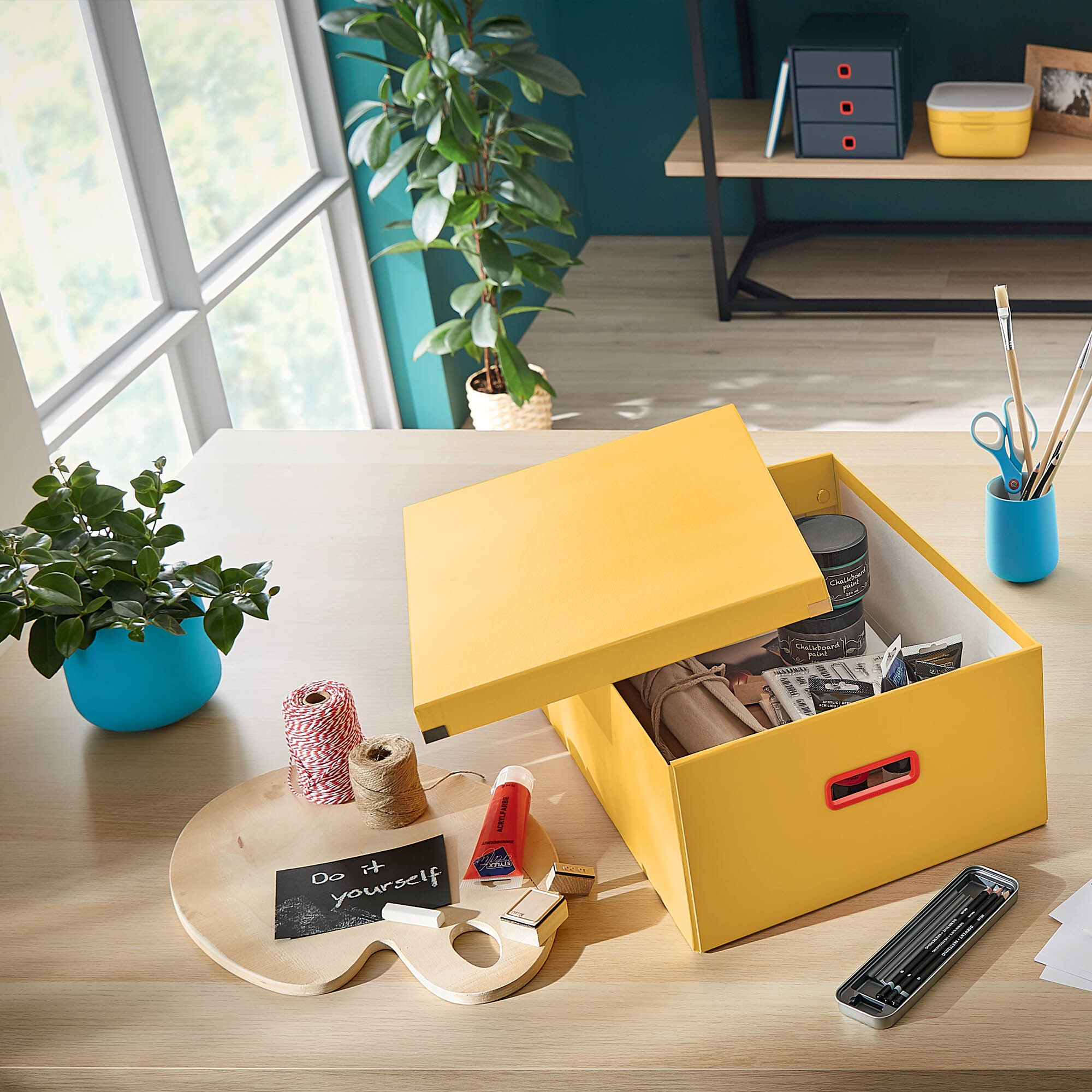 Atraktívna skladacia škatuľa Click & Store COSY univerzálnej veľkosti s vekom vhodná na ukladanie dokumentov, albumov, zakladačov a pod. až do veľkosti A4. Rýchle a jednoduché skladanie/rozkladanie pomocou patentov. Rozloženú škatuľu je možné umiestniť do veka a šetriť tak miesto. Má štýlové červené otvory na pohodlné uchopenie pri zdvíhaní a prenášaní. Prémiová kartónová škatuľa Leitz Cosy Click & Store je ideálna na udržiavanie poriadku doma i v kancelárii a pomáha vám rýchlo a jednoducho si zorganizovať prácu. Vďaka minimalistickému dizajnu a príjemným matným farbám môžete svojmu pracovnému priestoru pridať štýl a farbu. Kolekcia Leitz Cosy kombinuje komfort domáceho pohodlia s prvotriednou kvalitou a vytvára tak pozitívne a produktívne pracovné prostredie. Vyrobené z pevného vysokokvalitného kartónu pre dlhú životnosť, čistá, polomatná PP povrchová úprava. Váha 0,9 kg. Rozmery 281 x 200 x 370 mm.