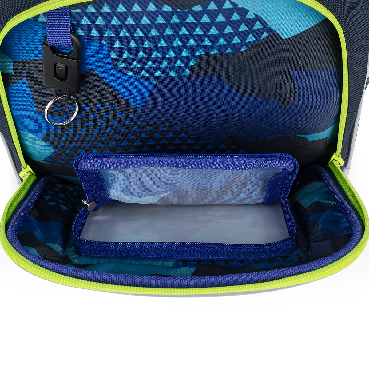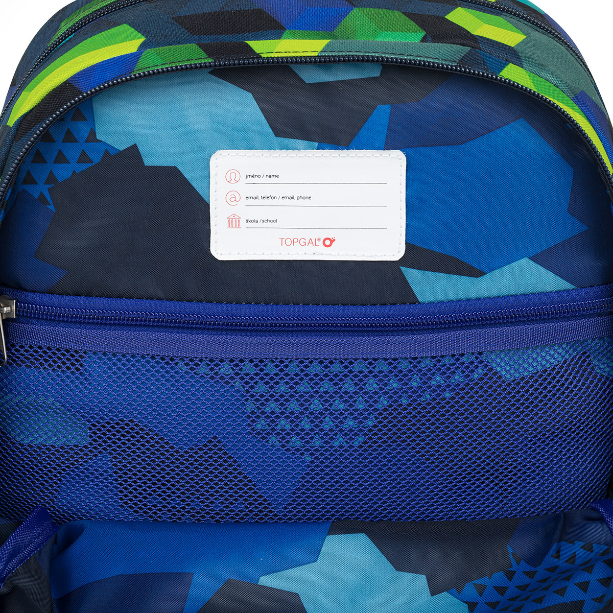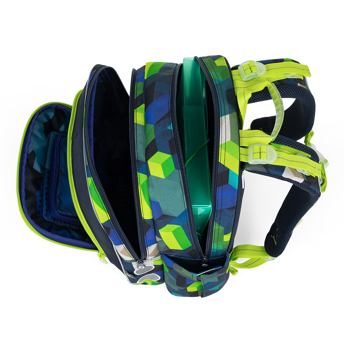 Taška má dve priestranné hlavné komory. Najťažšie učebnice alebo zošity si môžete uložiť do najširšej zadnej komory. Predná komora je o niečo užšia, vnútri je ukryté malé sieťované vrecko na zips a menovka.