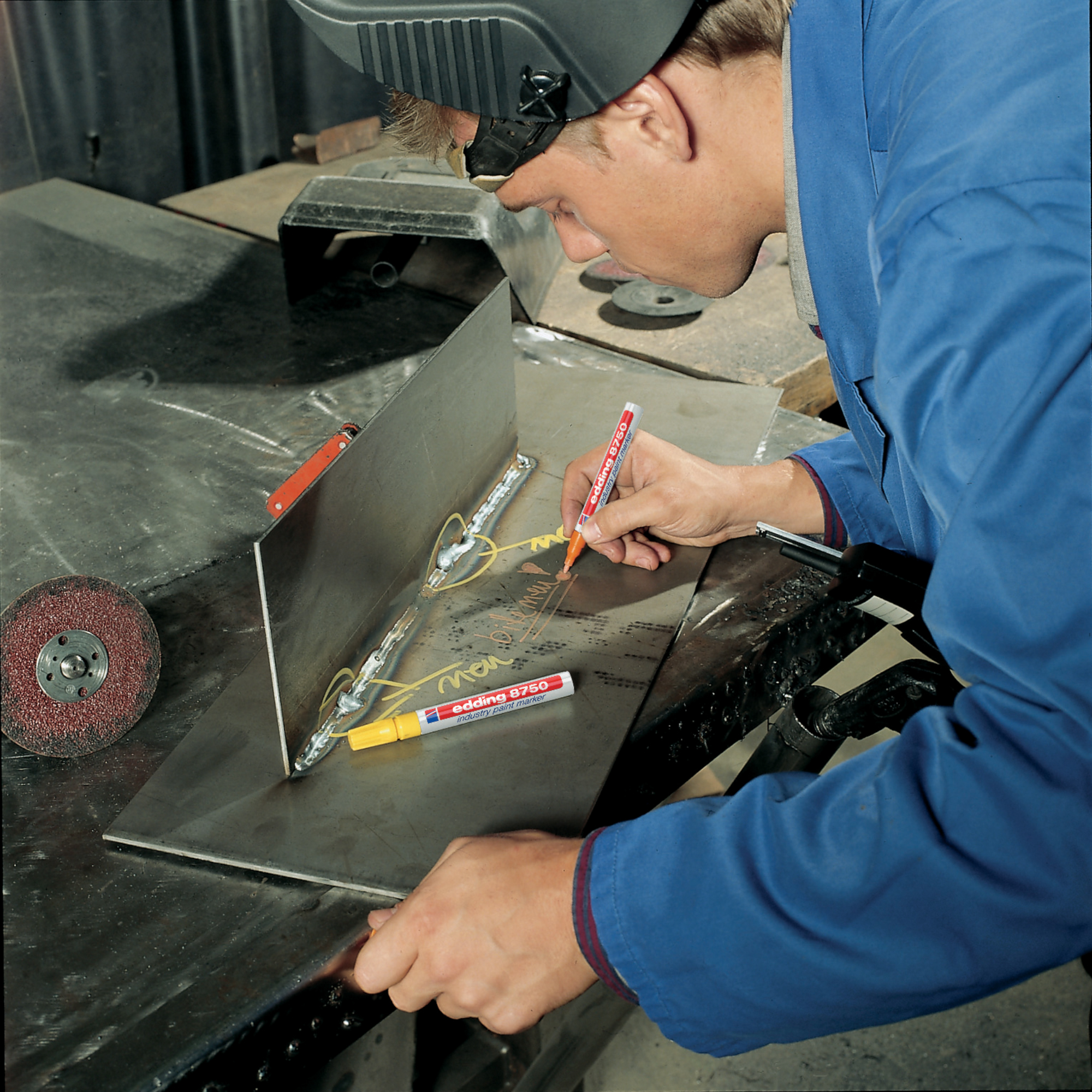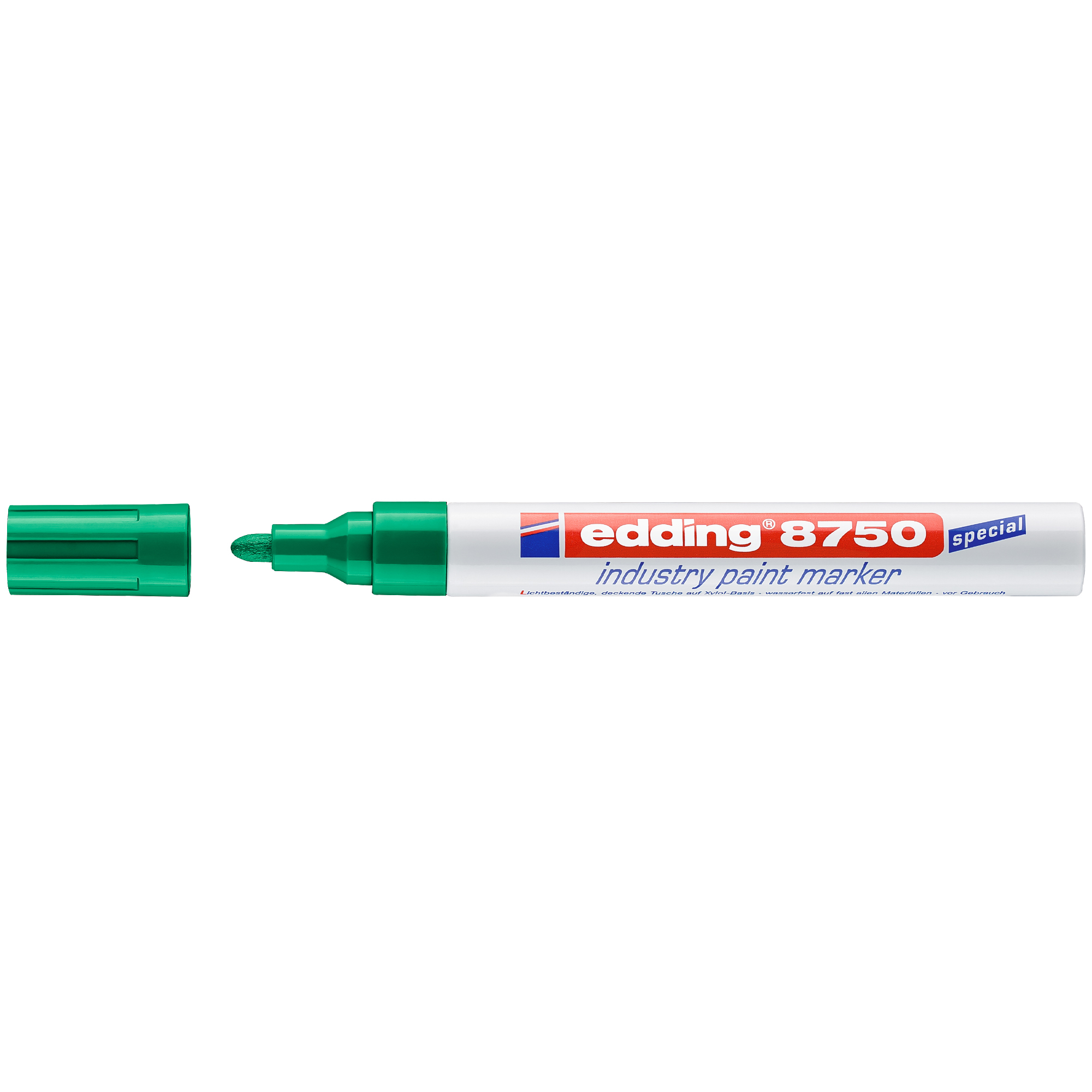 Priemyslový lakový popisovač edding 8750 je riešením pre permanentný popis a označovanie na mierne mastných, prašných a tmavých povrchov. Má nepriehľadný atrament odolný voči teplotám do 300C, je extrémne svetlostály a rýchloschnúci. Značenie dlhodobo ostáva odolné voči vode, opotrebeniu aj slanej vode. Šírka stopy okrúhleho hrotu je 2-4 mm. Dostupný v čiernej, červenej, modrej, zelenej, žltej, oranžovej a bielej farbe. Vhodné náhradné hroty (edding 750 náhradné hroty) sú dostupné. Vysoko kvalitné hliníkové telo.