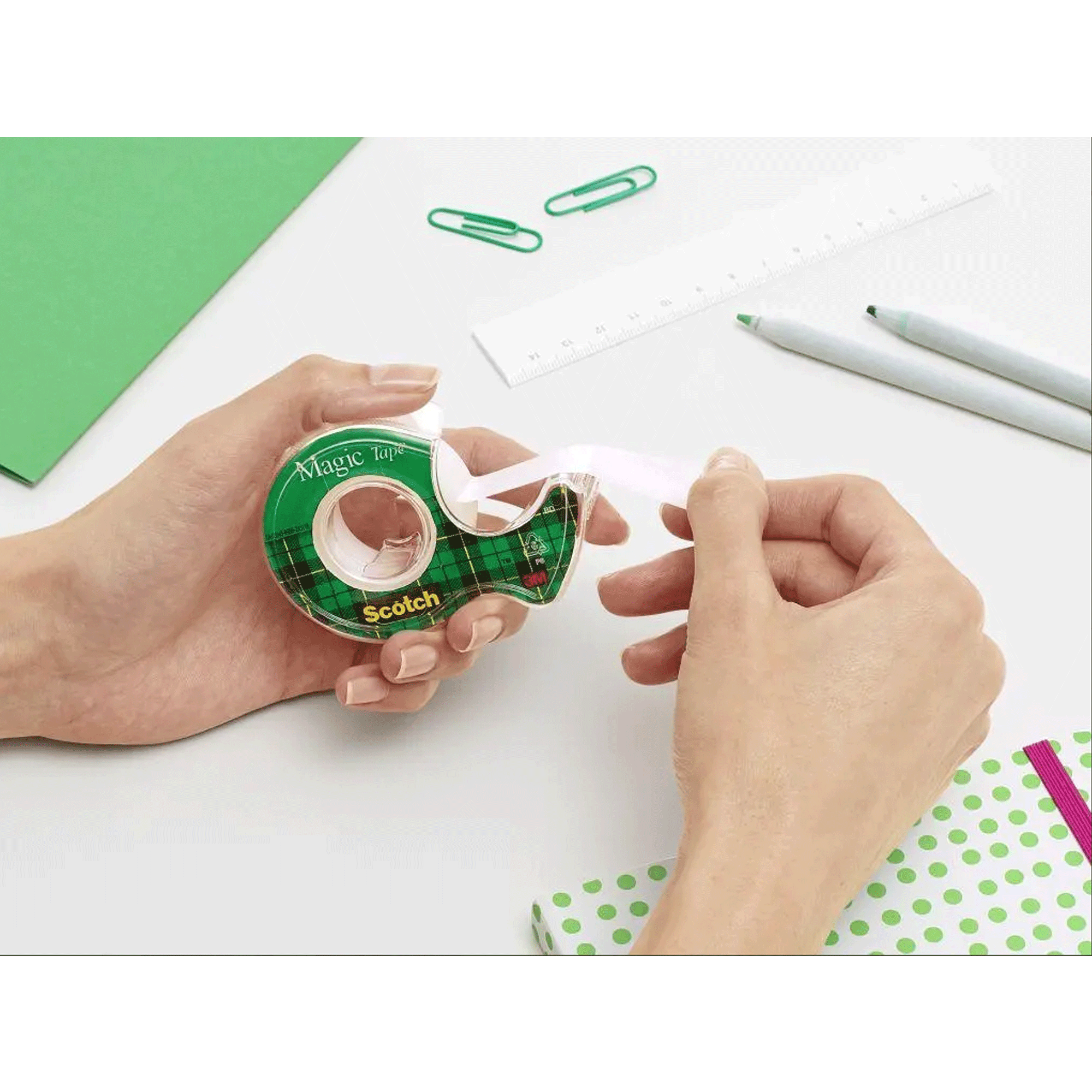 Moderný a spoľahlivý dávkovač lepiacej pásky, ktorý umožňuje odvíjanie rôznych typov lepiacich pások s použitím jednej ruky. Súčasťou balenia je neviditeľná páska Scotch Magic rozmerov 19 mm × 33 m. Farba zelená.