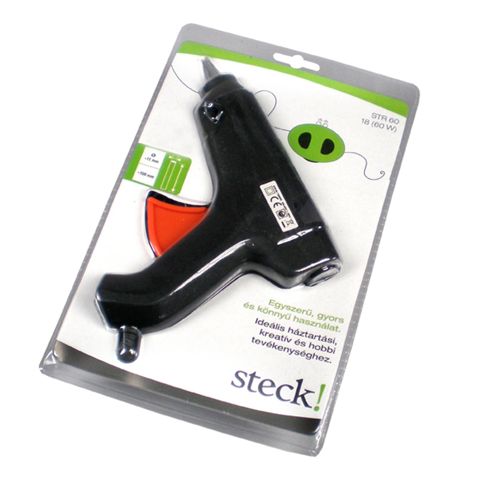 **Tavná lepiaca pištoľ STECK** je ideálnym nástrojom pre rôzne kreatívne a opravné práce. Balenie obsahuje 2 ks lepiacich tyčiniek, ktoré umožňujú okamžité používanie. Táto pištoľ s výkonom 60W výborne lepí materiály ako drevo, keramiku, sklo, plast, porcelán a kovy. Je vhodná pre domácich majstrov aj profesionálov, ktorí potrebujú rýchle a spoľahlivé lepenie rôznych povrchov. používa lepiace tyčinky pr.11mm