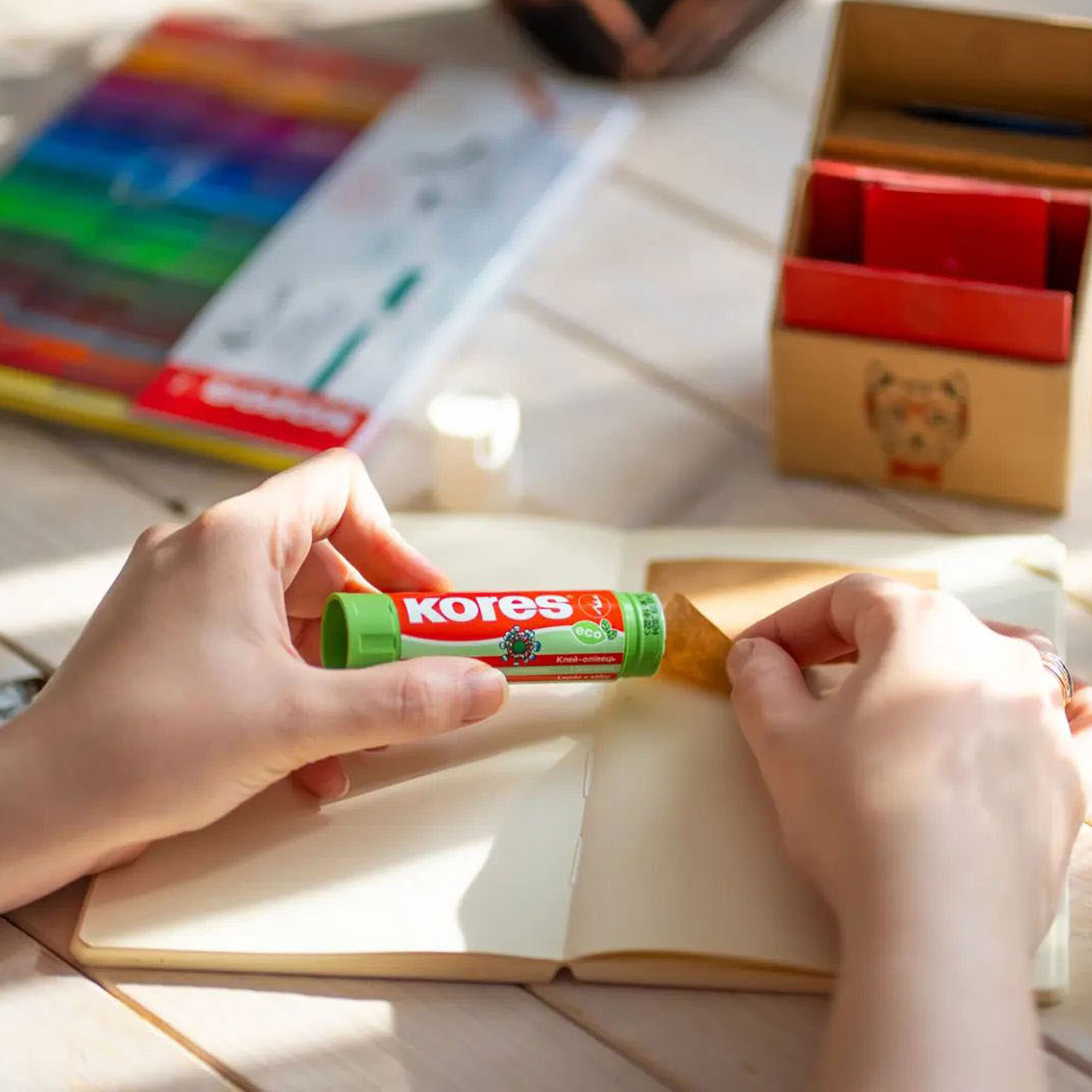 Lepiaca tyčinka Kores ECO je ekologická voľba pre každodenné lepenie. Obsahuje 95 % lepiacej hmoty z prírodných materiálov a jej obal je vyrobený z 85 % recyklovaného materiálu. Vďaka obsahu glycerínu umožňuje jemné a hladké nanášanie bez zanechávania stôp.