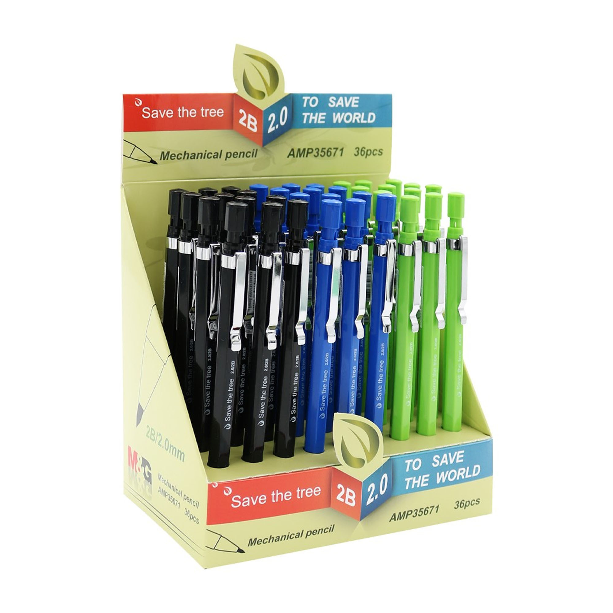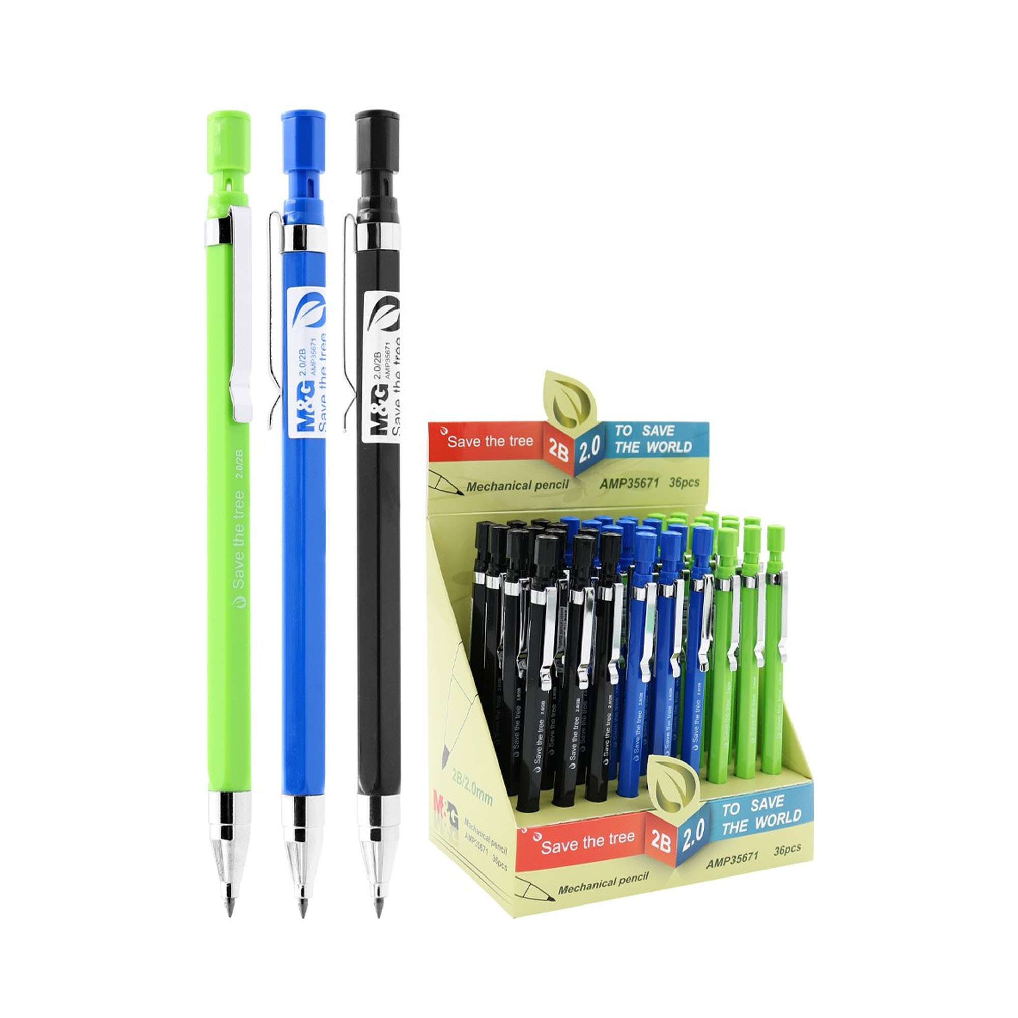 Plastová mechanická ceruzka – verzatilka s krokovým vysúvaním tuhy priemeru 2mm. Univerzálna tvrdosť tuhy 2B vhodná na bežné písanie a kreslenie. Ceruzka je vybavená s kovovým klipom a stláčacim mechanizmom. Dodávané v mix farieb.