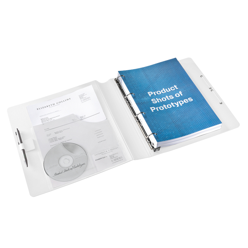 Biely prezentačný štvorkrúžkový zakladač A4 s mechanikou pr.16mm. Má transparentné predné a chrbtové vrecko na zasunutie vlastného prezentačného materiálu. Toto riešenie umožňuje prispôsobiť zoraďovač svojim potrebám. Vhodné na prezentácie výrobkov, cenníkov, manuálov a pod. Vyrobené z kartónu potiahnutého polypropylénovou fóliou (PP), ktorá je šetrná k životnému prostrediu a nepodlieha klimatickým zmenám. Fólia je prilepená na kartón, preto nedochádza k nevzhľadným bublinám.