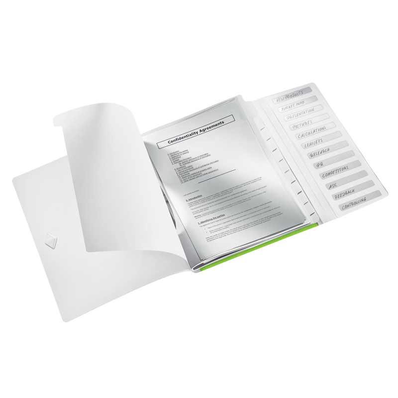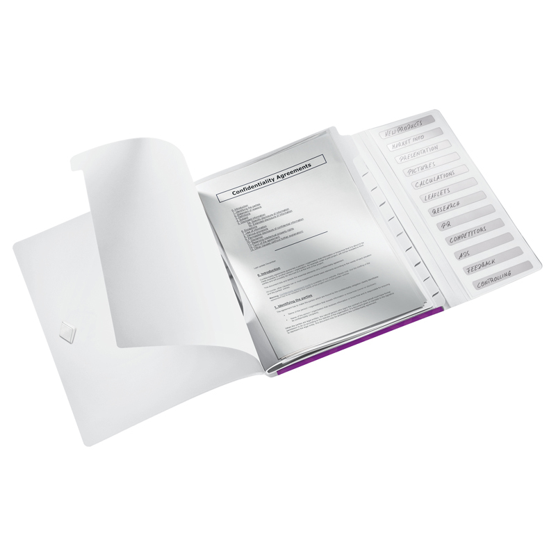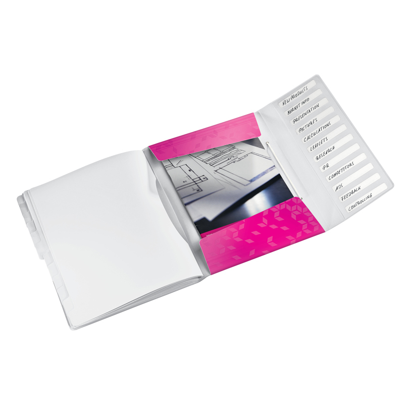 Ľahká biela aktovka z dizajnovej rady Leitz WOW zo šiestimi priehradkami a s registrom na popis a triedenie obsahu. Určená na pohodlný prenos a organizáciu dokumentov. Špeciálna priehradka na prednej strane na uloženie voľných predmetov alebo poznámkového bloku. Má praktické a atraktívne uzatváranie gumičkou na bezpečný prenos dokumentov. Žiarivé farby WOW s dvojfarebným efektom a so štýlovým geometrickým vzorom. Žiarivé farby WOW, ktoré zaujmú na prvý pohľad a sú určené pre výnimočné pracovné prostredie. Pojme až do 250 listov 80g papiera. Vyrobené z vysokokvalitného PP. Farba biela. Formát A4. Rozmer: 254x330x38mm. Väčšie balenie 5ks.