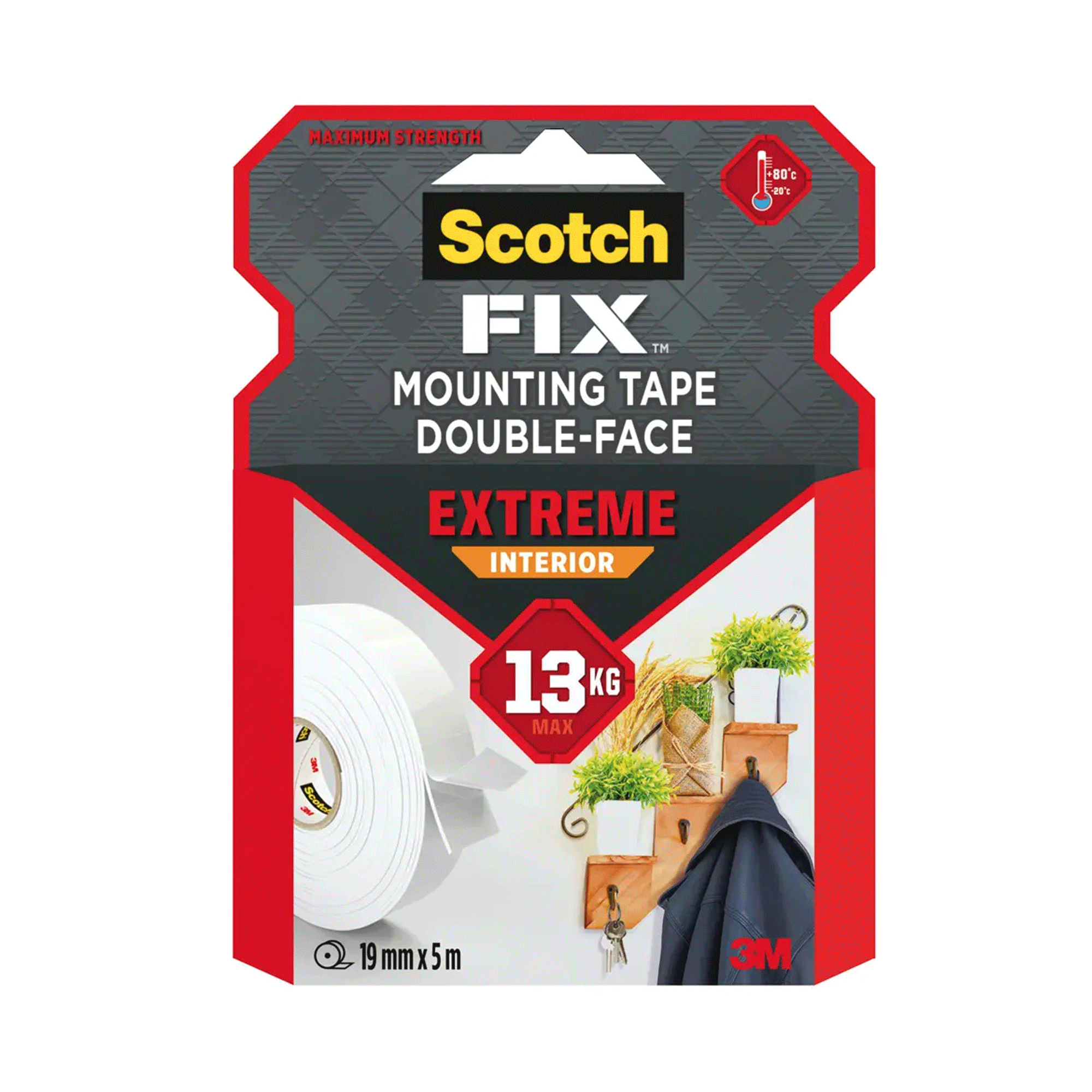 Supersilná montážna páska Scotch-Fix™ do interiéru s pokročilou technológiou 3M™. Táto vysoko kvalitná, prispôsobivá permanentná páska s nosnosťou do 13 kg je určená na extrémne použitie v interiéri a ako jediná montážna páska je vhodná aj na plasty, vrátane tvrdých plastov, ako napríklad PP a PE. Taktiež je ideálna na kovy, hladké a lakované/maľované povrchy a drevo. Rozmery 19 mm × 5 m.